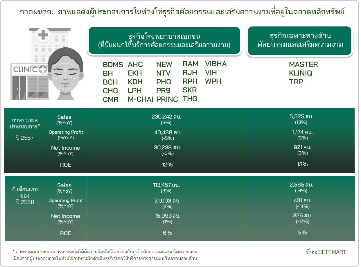 ปัจจุบันมูลค่าตลาดธุรกิจศัลยกรรมและเสริมความงามกว่า 85% จะมาจากกลุ่มคลินิก แต่มีแนวโน้มลดลงจากการแข่งขันที่รุนแรง