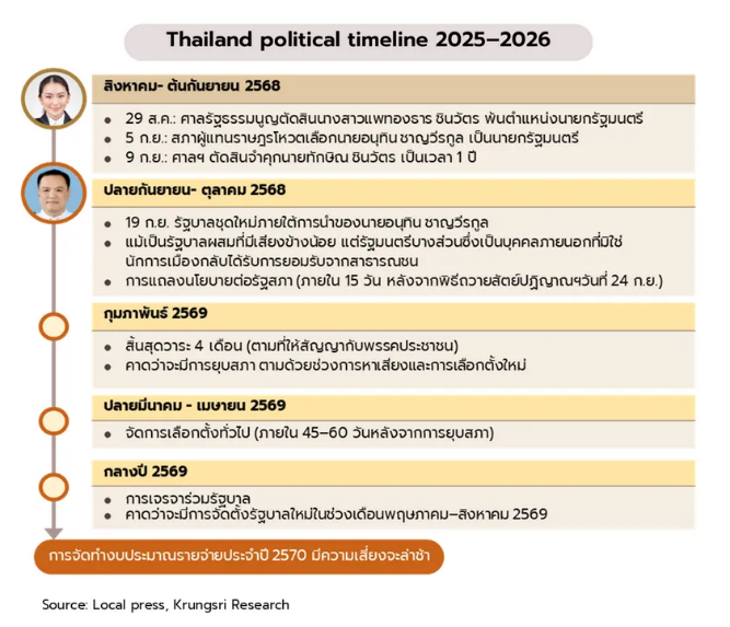 GDP ในไตรมาส 3 อาจลดลงจากไตรมาสก่อน แต่คาดว่าจะกระเตื้องขึ้นเล็กน้อยในไตรมาสสุดท้ายของปี ล่าสุดรัฐบาลชุดใหม่ภายใต้การนำของนายอนุทิน ชาญวีรกุล หัวหน้าพรรคภูมิใจไทย เบื้องต้นมีการเตรียมแถลงนโยบายต่อรัฐสภาในช่วงปลายเดือนกันยายนถึงต้นเดือนตุลาคมนี้ ซึ่งจะถือเป็น “วันแรก” ของการบริหารประเทศอย่างเป็นทางการภายใต้กรอบเวลาเพียง 4 เดือนก่อนจะประกาศยุบสภาฯเพื่อกำหนดการเลือกตั้งใหม่ รัฐบาลชุดนี้จึงถูกจับตามองอย่างใกล้ชิดว่ามีศักยภาพเพียงใดในการสร้างความต่อเนื่องด้านนโยบายและการขับเคลื่อนกิจกรรมทางเศรษฐกิจ
