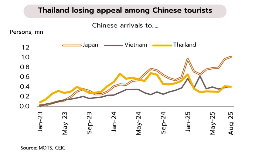 การท่องเที่ยวของไทยยังคงฟื้นตัวอย่างอ่อนแอ โดยมีแรงกดดันสำคัญจากตลาดนักท่องเที่ยวจีนที่หดตัวต่อเนื่อง โดยในเดือนสิงหาคมมีนักท่องเที่ยวจีนเพียง 0.4 ล้านคน ลดลง -37.7% YoY และในช่วง 8 เดือนแรกของปีนี้มีเพียง 3.1 ล้านคน ลดลง -35.3% YoY หรือคิดเป็นเพียงประมาณ 40% ของระดับก่อนการแพร่ระบาดในปี 2562 ปัจจัยดังกล่าวสะท้อนถึงความกังวลด้านความปลอดภัยและการเปลี่ยนแปลงพฤติกรรมการเดินทางของนักท่องเที่ยวจีนที่หันไปเลือกจุดหมายปลายทางอื่นเพิ่มขึ้น ไม่เพียงแต่ญี่ปุ่นเท่านั้นหากยังรวมถึงประเทศในอาเซียน โดยเฉพาะเวียดนามซึ่งในช่วง 8 เดือนแรกของปีนี้สามารถดึงดูดนักท่องเที่ยวจีนได้ถึง 3.5 ล้านคน สูงกว่าไทยอย่างมีนัยสำคัญ รวมถึงมาเลเซียที่ได้รับความนิยมมากขึ้นเช่นกัน สถานการณ์ดังกล่าวนี้สะท้อนว่าไทยกำลังสูญเสียความสามารถในการแข่งขันในตลาดจีนซึ่งเคยเป็นตลาดหลักของการท่องเที่ยวไทย และตอกย้ำว่าแนวโน้มการฟื้นตัวของภาคท่องเที่ยวในช่วงที่เหลือของปี 2568 ยังคงเผชิญความท้าทายสูง หากไม่มีมาตรการเชิงรุกเพื่อแก้ไขปัญหาดังกล่าวข้างต้น โดยเฉพาะภาพลักษณ์ด้านความปลอดภัย อาจทำให้บทบาทของการท่องเที่ยวในฐานะที่เคยเป็นแรงขับเคลื่อนหลักของเศรษฐกิจไทยลดลงในระยะถัดไป