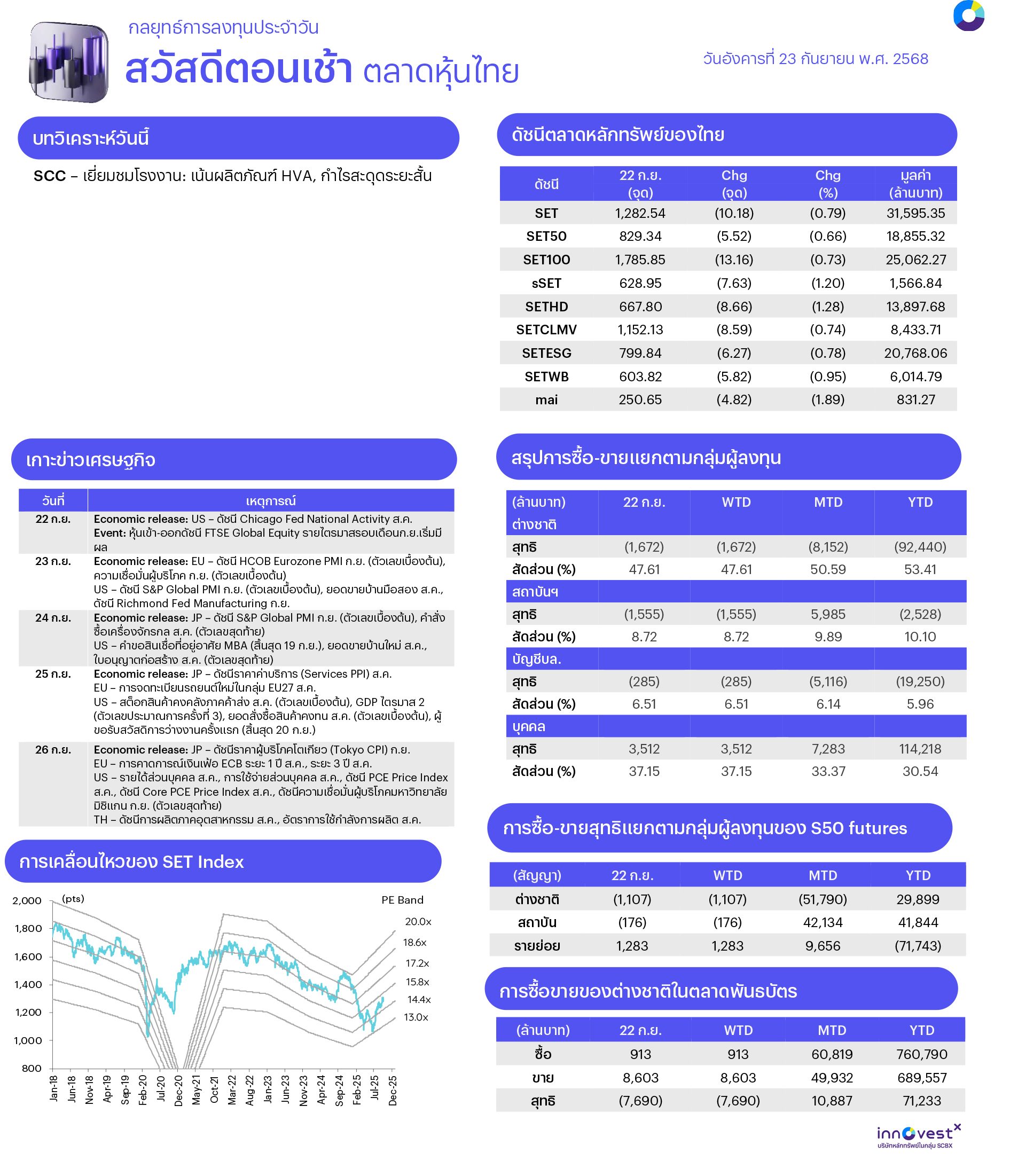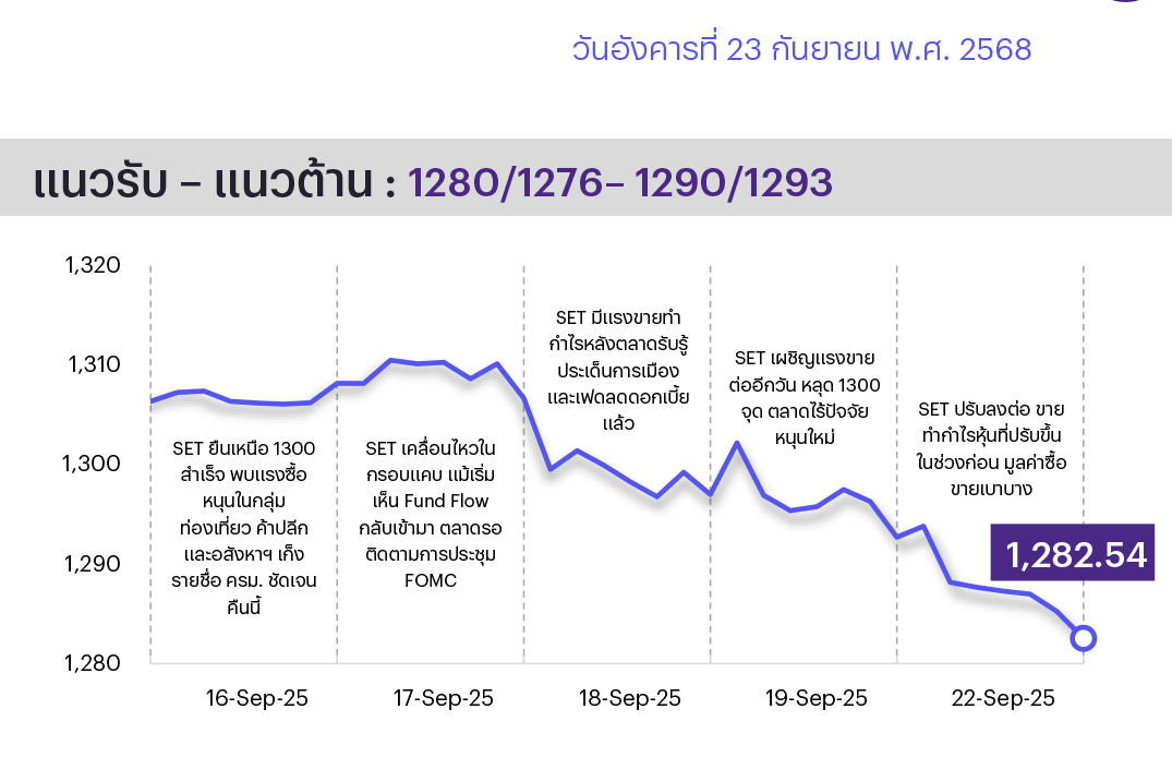 คาดตลาดแกว่งไซด์เวย์/รีบาวด์ได้ที่แนวรับ นักลงทุนต่างชาติยังคงขายสุทธิต่อแต่เริ่มลดระดับลง ในขณะที่ค่าเงินบาทหากยังชะลอการอ่อนค่าต่อจะเริ่มเป็นสัญญาณบวก ตลาดติดตามนโยบายกระตุ้นเศรษฐกิจใหม่ๆ ที่น่าจะมีความชัดเจนออกมาในช่วงต่อจากนี้หลังถวายสัตย์ฯ วันที่ 24 ก.ย. ทางเทคนิค การปรับตัวลงมาต่อเนื่องเริ่มเปิดโอกาสในการรีบาวด์โดยเฉพาะที่แนวรับ 1280/1276 ที่จะทำให้มีช่วงดีดกลับได้ ส่วนการปรับตัวขึ้นมีแนวต้านที่ 1290/1293