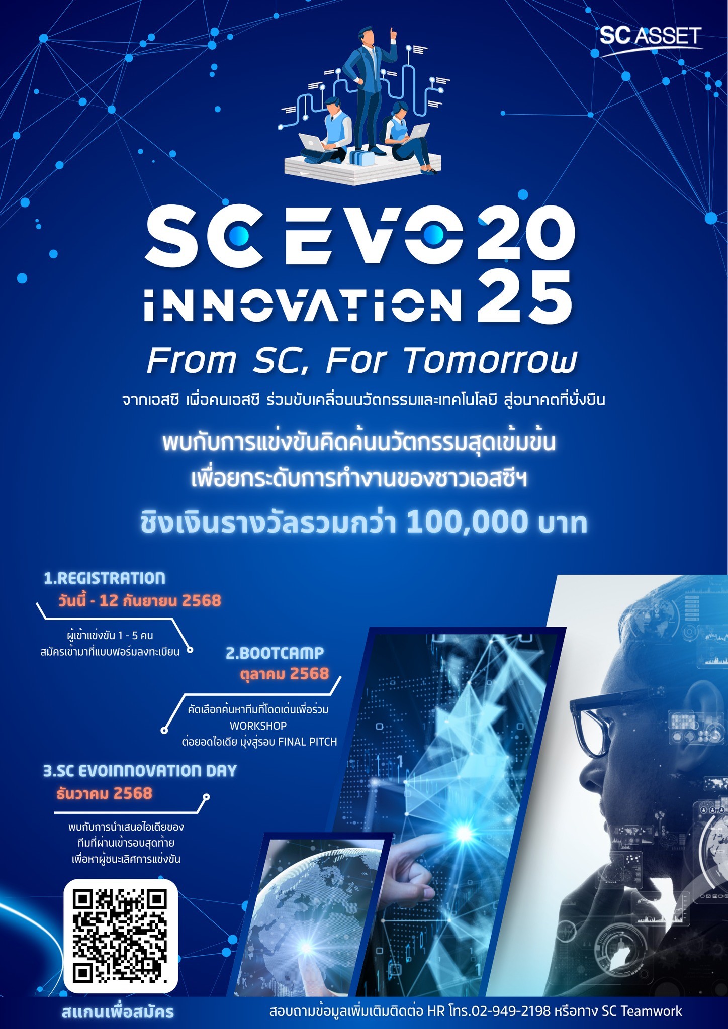 SC Asset บริษัทอสังหาฯ ที่มุ่งสร้างคุณค่าภายใต้แนวคิดการเติบโตควบคู่ไปกับความยั่งยืนเดินหน้ายกระดับศักยภาพบุคลากรทุกระดับในองค์กร เปิดตัวกลยุทธ์ SC EVO Innovation 2025 ภายใต้แนวคิด “From SC, For Tomorrow” เพื่อปลุกพลังพนักงานให้ก้าวสู่บทบาท Digital Innovator อย่างแท้จริง