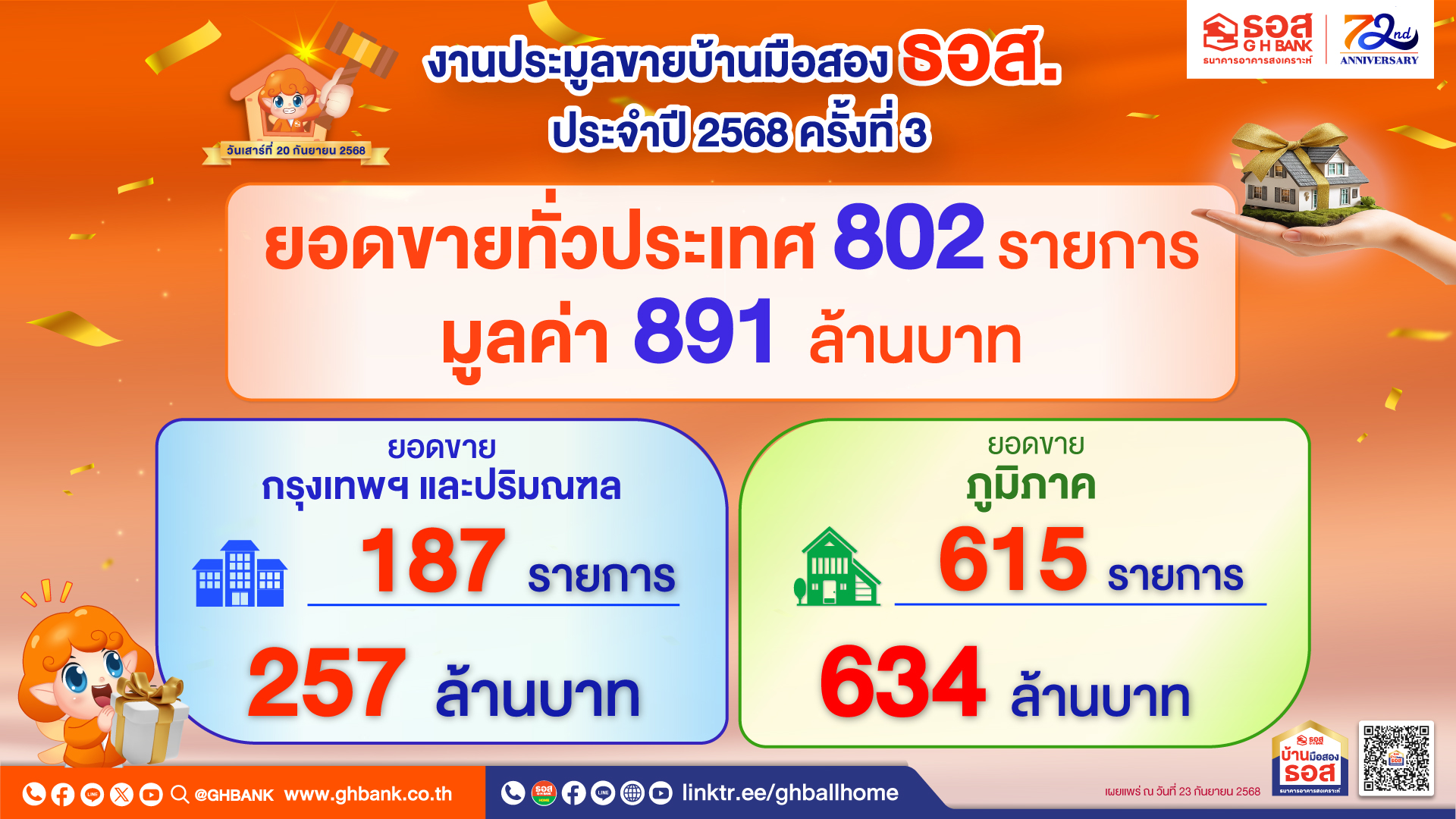ธนาคารอาคารสงเคราะห์ (ธอส.) รายงานผลการจัดงาน ประมูลขายบ้านมือสอง ธอส. ประจำปี 2568 ครั้งที่ 3 เมื่อวันเสาร์ที่ 20 กันยายน 2568 ระหว่างเวลา 10.00 – 16.00 น. ได้รับความสนใจจากลูกค้าเป็นจำนวนมาก ทำให้สามารถจำหน่ายบ้านมือสองได้สูงถึง 802 รายการ มูลค่ารวม 891 ล้านบาท โดยเป็นทรัพย์ที่ตั้งอยู่ในพื้นที่กรุงเทพ ฯ และปริมณฑลจำนวน 187 รายการ รวมมูลค่า 257 ล้านบาท และทรัพย์ในเขตภูมิภาคจำนวน 615 รายการ รวมมูลค่า 634 ล้านบาท โดยทรัพย์ที่ประมูลขายได้ในราคาสูงสุด 7,010,000 บาท ได้แก่ ทรัพย์ประเภทบ้านเดี่ยว 2 ชั้น ขนาดเนื้อที่ 60.2 ตารางวา ในเขตคันนายาว กรุงเทพ ฯ ซึ่งเป็นทรัพย์ที่มีทำเลดี การเดินทางสะดวก