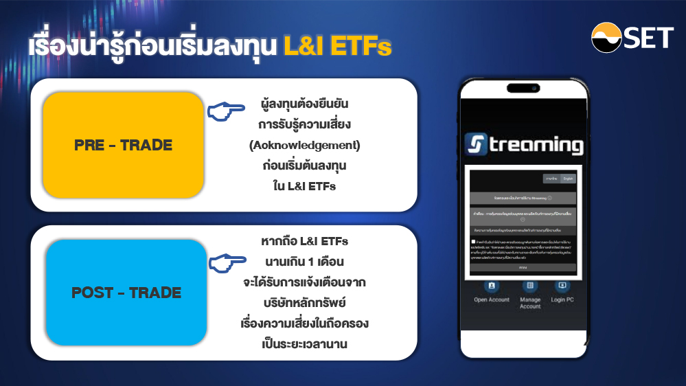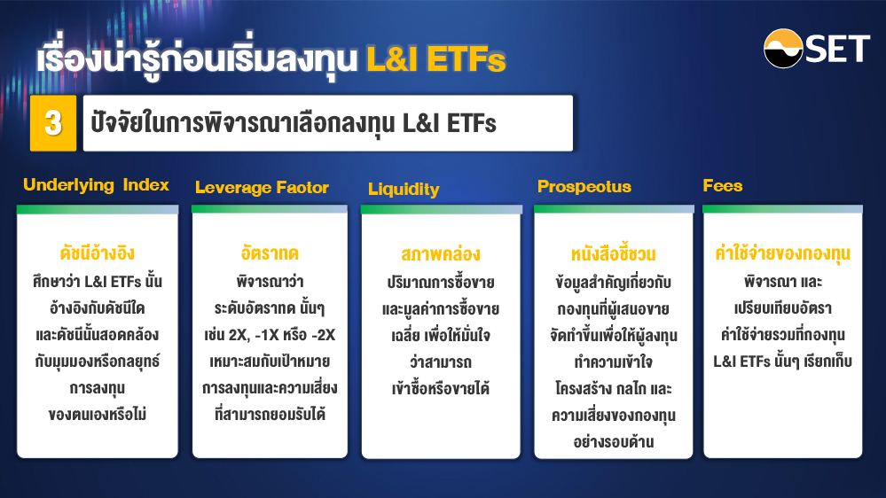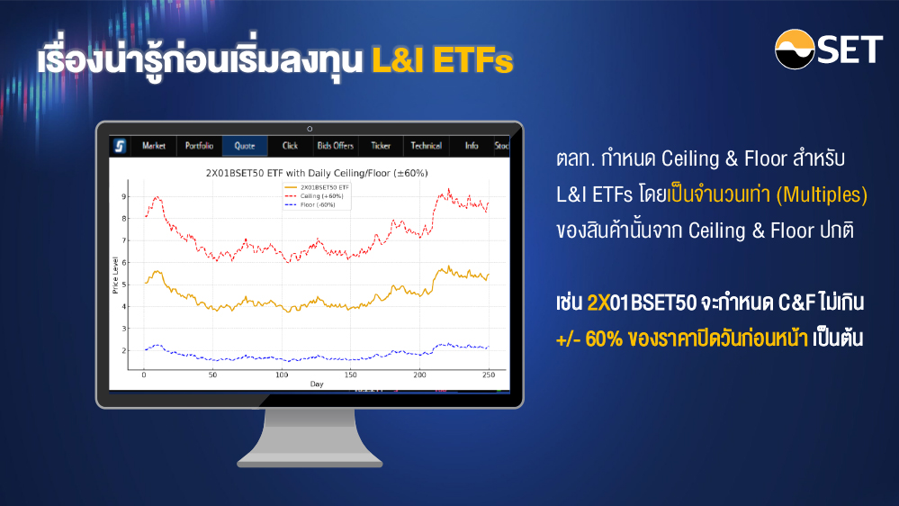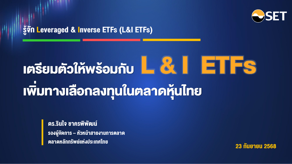 สำหรับ Leveraged และ Inverse ETF ที่จะซื้อขายในตลาดหลักทรัพย์ฯ ครั้งแรกนั้น จะมีจำนวน 3 กองทุน และอ้างอิงดัชนี SET50 Total Return Index (SET50 TRI) ออกโดย บริษัทหลักทรัพย์จัดการกองทุน บางกอกแคปปิตอล จำกัด (BCAP) และมีบริษัทหลักทรัพย์ บัวหลวง จำกัด (มหาชน) เป็นผู้จัดจำหน่ายและผู้ดูแลสภาพคล่อง โดย L&I ETF จะเริ่มซื้อขายในตลาดหลักทรัพย์ฯ ในวันที่ 26 กันยายน 2568 ทั้งนี้ ผู้สนใจลงทุนสามารถศึกษาข้อมูลเพิ่มเติมได้ที่ www.set.or.th/th/market/product/etf/leveraged-and-inverse-etf