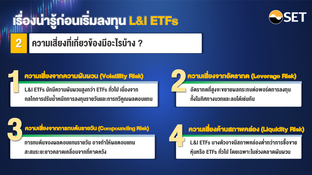 Leveraged และ Inverse ETF หรือ L&I ETF เป็นนวัตกรรมที่ช่วยเพิ่มประสิทธิภาพและกลยุทธ์ในการลงทุน โดย Leveraged ETF จะเป็น ETF ที่ให้ผลตอบแทนไปทางเดียวกับดัชนีอ้างอิง และเป็น “ตัวเพิ่มกำไร” โดยให้ผลตอบแทนเป็นจำนวนเท่าของผลตอบแทนรายวันของดัชนีอ้างอิง ซึ่งเหมาะกับกรณีที่คาดว่าตลาดจะมีแนวโน้มเป็นขาขึ้น ส่วน Inverse ETF จะเป็น ETF ที่ให้ผลตอบแทนไปทางตรงข้ามกับดัชนีอ้างอิง ทำหน้าที่เป็น “ตัวเสริมพอร์ต” ในการสร้างโอกาสการทำกำไรหรือใช้ป้องกันความเสี่ยง ในกรณีที่คาดว่าทิศทางตลาดจะปรับลง โดยผู้ลงทุนสามารถเลือกอัตราทดหรืออัตราทวีคูณของ ETF ให้เหมาะสมตามความต้องการและความสามารถในการรับความเสี่ยงของผู้ลงทุน