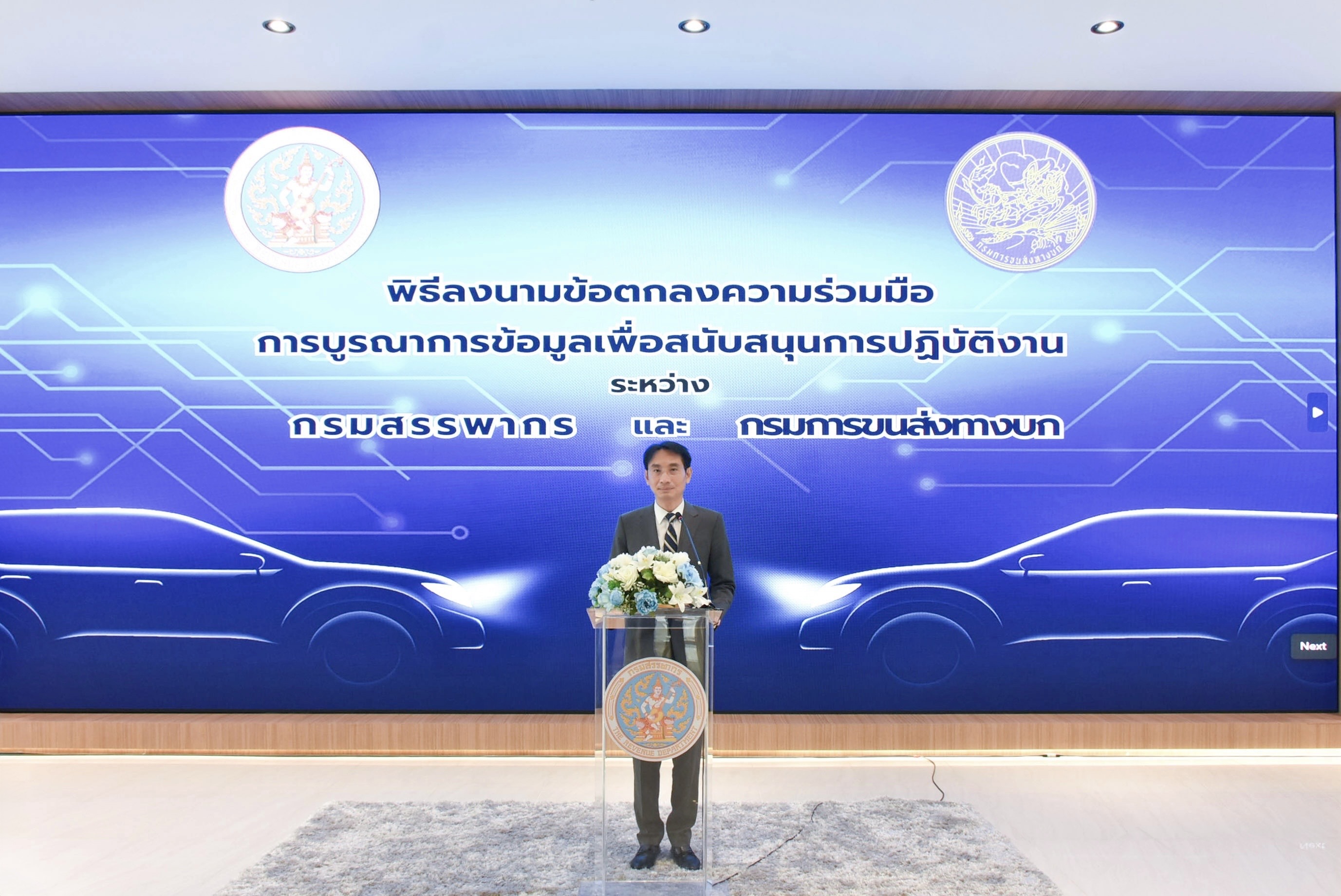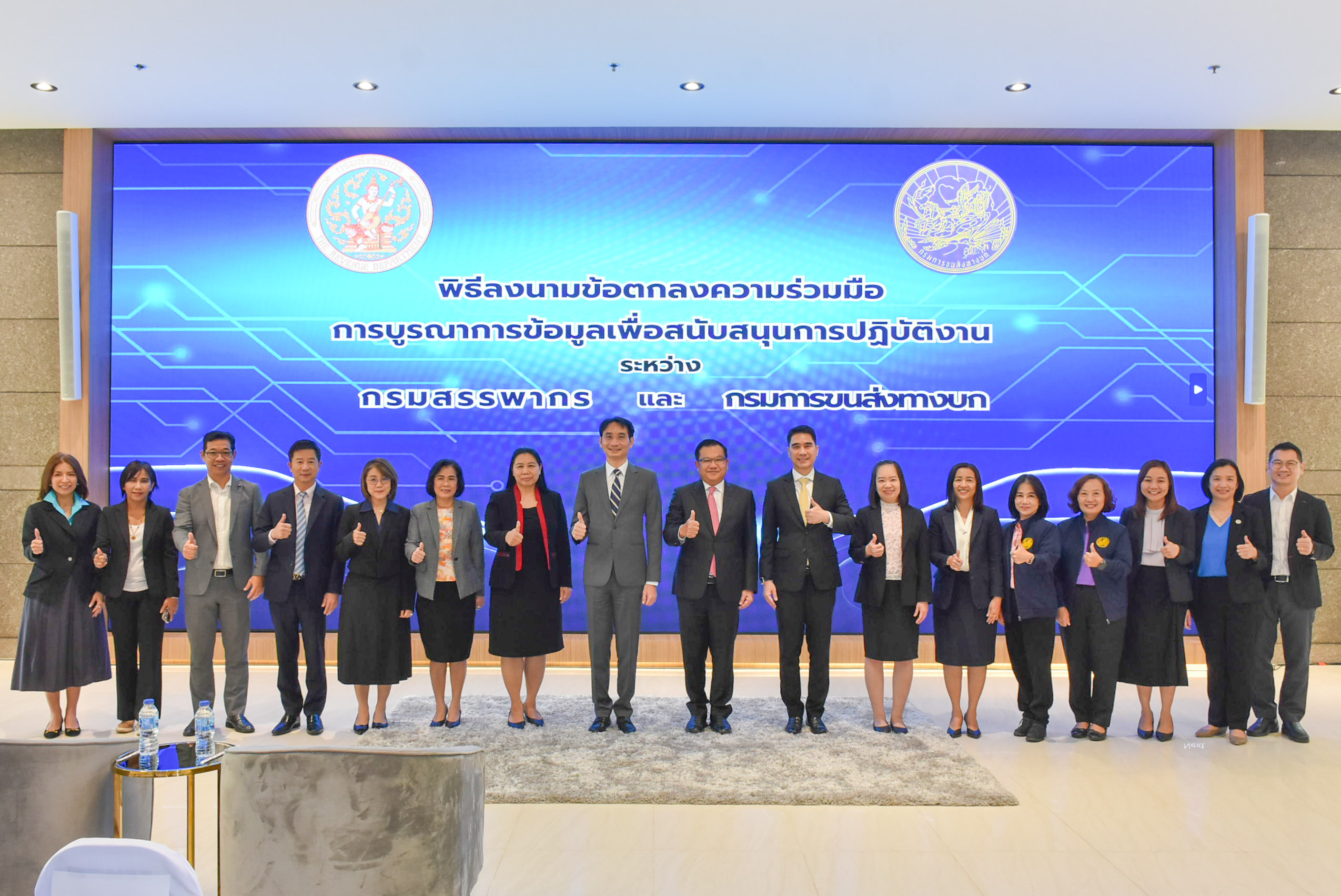 นายปิ่นสาย สุรัสวดี อธิบดีกรมสรรพากร และนายจิรุตม์ วิศาลจิตร อธิบดีกรมการขนส่งทางบก ได้ร่วมลงนามในบันทึกข้อตกลงความร่วมมือ (MOU) ณ กรมสรรพากร เพื่อบูรณาการข้อมูลระหว่างสองหน่วยงาน โดยมีเป้าหมายเพื่อเพิ่มประสิทธิภาพการจัดเก็บภาษีอากรให้ครอบคลุมและเป็นธรรม ควบคู่กับการยกระดับการให้บริการประชาชนของทั้งสองหน่วยงาน ให้เกิดประสิทธิภาพสูงสุด