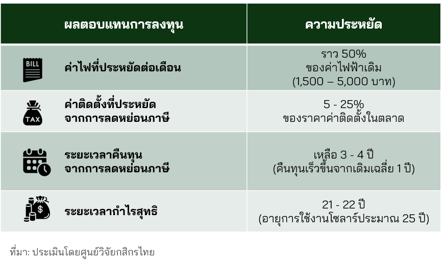 นอกจากนี้ สิทธิลดหย่อนภาษียังช่วยให้การติดตั้งโซลาร์คืนทุนไวขึ้นเฉลี่ย 1 ปี ใช้เวลาคืนทุนเหลือเพียง 3 - 4 ปี หลังจากนั้นผู้ใช้สิทธิลดหย่อนจะได้กำไร 21 - 22 ปี ก่อนจะต้องเริ่มเปลี่ยนแผงโซลาร์ใหม่ตั้งแต่ปีที่ 25 เป็นต้นไป