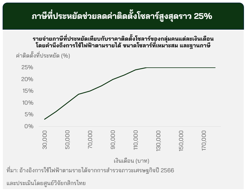 ศูนย์วิจัยกสิกรไทยมองว่า กลุ่มที่ได้ประโยชน์สูงสุดจากการลดหย่อนภาษีติดตั้งโซลาร์ คือผู้มีรายได้ 120,000 - 180,000 บาทต่อเดือน ประหยัดภาษีได้มากสุดราว 50,000 บาทต่อปี ขณะที่กลุ่มรายได้ต่ำกว่า 30,000 บาทต่อเดือนจะไม่ได้สิทธิเพราะไม่เสียภาษี ส่วนผู้มีรายได้สูงกว่าช่วงดังกล่าว มักต้องใช้โซลาร์ขนาดเกิน 10 kW ซึ่งไม่ครอบคลุมในมาตรการนี้