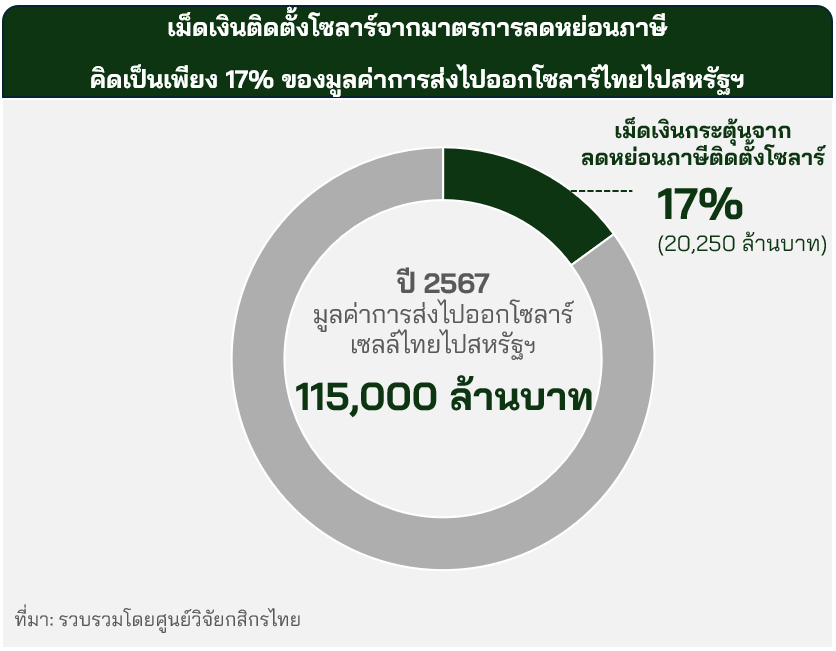 ศูนย์วิจัยกสิกรไทยมองว่า มาตรการนี้ช่วยกระตุ้นอุตสาหกรรมโซลาร์เซลล์ได้เพียงบางส่วน ราว 20,250 ล้านบาท (ประมาณ 90,000 ครัวเรือน) ตลอดโครงการ หรือเพียง 17% ของมูลค่าที่ไทยส่งออกไปสหรัฐฯ ในปี 2567 ซึ่งสหรัฐฯ นับเป็นคู่ค้าสำคัญของไทยและปรับขึ้นภาษีในช่วงที่ผ่านมา