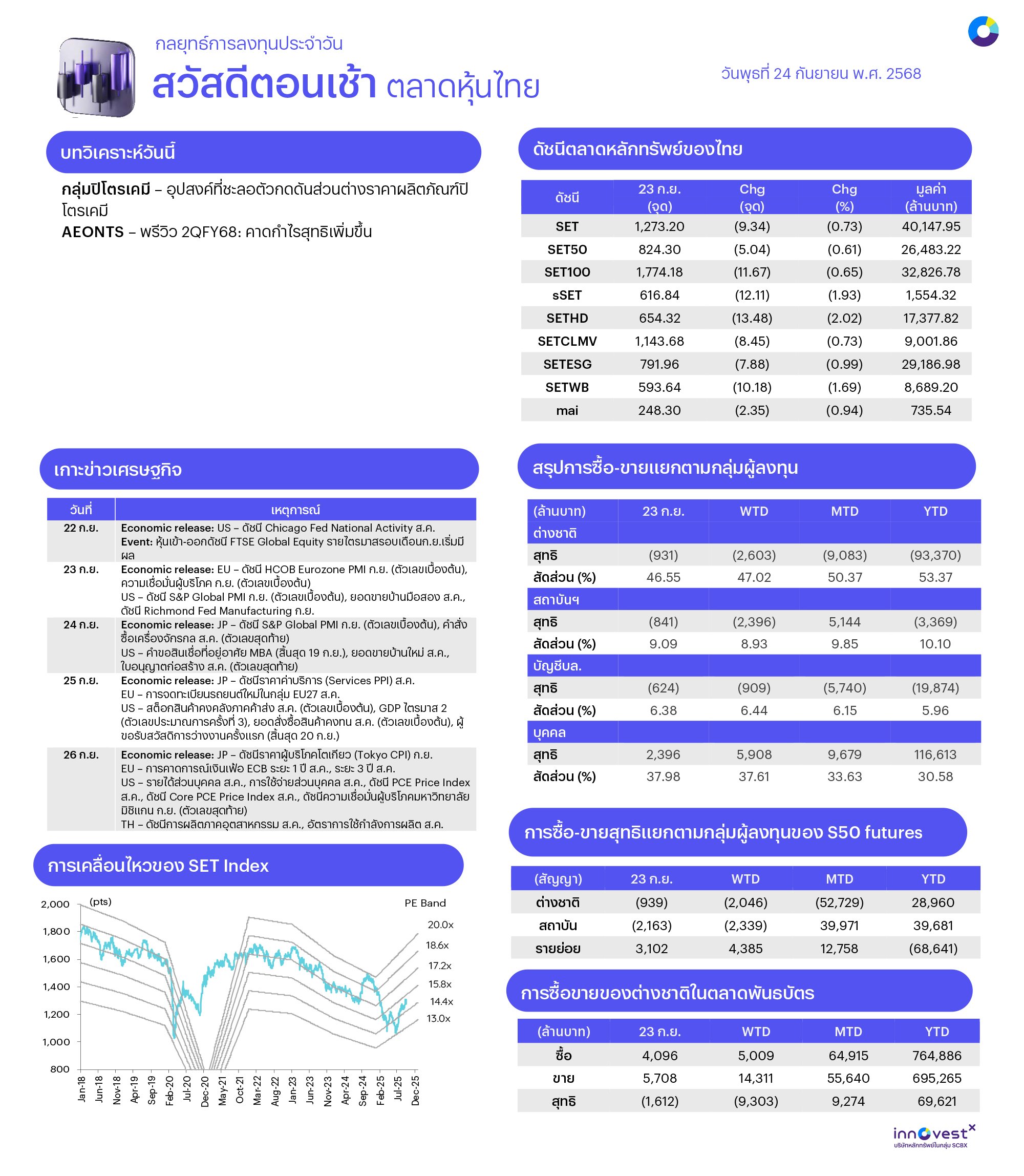 ช่วงสั้นมอง SET มีโอกาสพักฐานหรือแกว่งตัวในกรอบแคบ หลังขาดปัจจัยหนุนใหม่ ปัจจัยในประเทศยังอยู่ระหว่างรอติดตามแผนการออกมาตรการกระตุ้นเศรษฐกิจของรัฐบาลใหม่ ซึ่งจะมีผลต่อการเรียกความเชื่อมั่นการลงทุนให้ฟื้นตัวและการไหลเข้าของ Fund Flow ในระยะถัดไป ขณะที่ปัจจัยต่างประเทศติดตามตัวเลขเศรษฐกิจสำคัญของสหรัฐฯ อาทิ PMI และ PCE ซึ่งหากออกมาแย่กว่าตลาดคาด จะมีผลต่อการพิจารณาตัดสินใจเร่งลดดอกเบี้ยนโยบายของเฟดในระยะถัดไป อย่างไรก็ดีมอง SET เริ่มมี Upside จำกัดและอาจชะลอการขึ้นสั้นบ้าง หลังดัชนีปรับขึ้น 19% ในช่วง 3 เดือนที่ผ่านมา แต่ Downside ยังจำกัดเช่นกัน หลังเริ่มเห็น Fund Flow ชะลอการขาย ประเมิน SET มีแนวต้านบริเวณ 1320 และมีแนวรับ 1280 ดังนั้นกลยุทธ์ลงทุนจึงคงแนะนำให้ “Selective Buy”