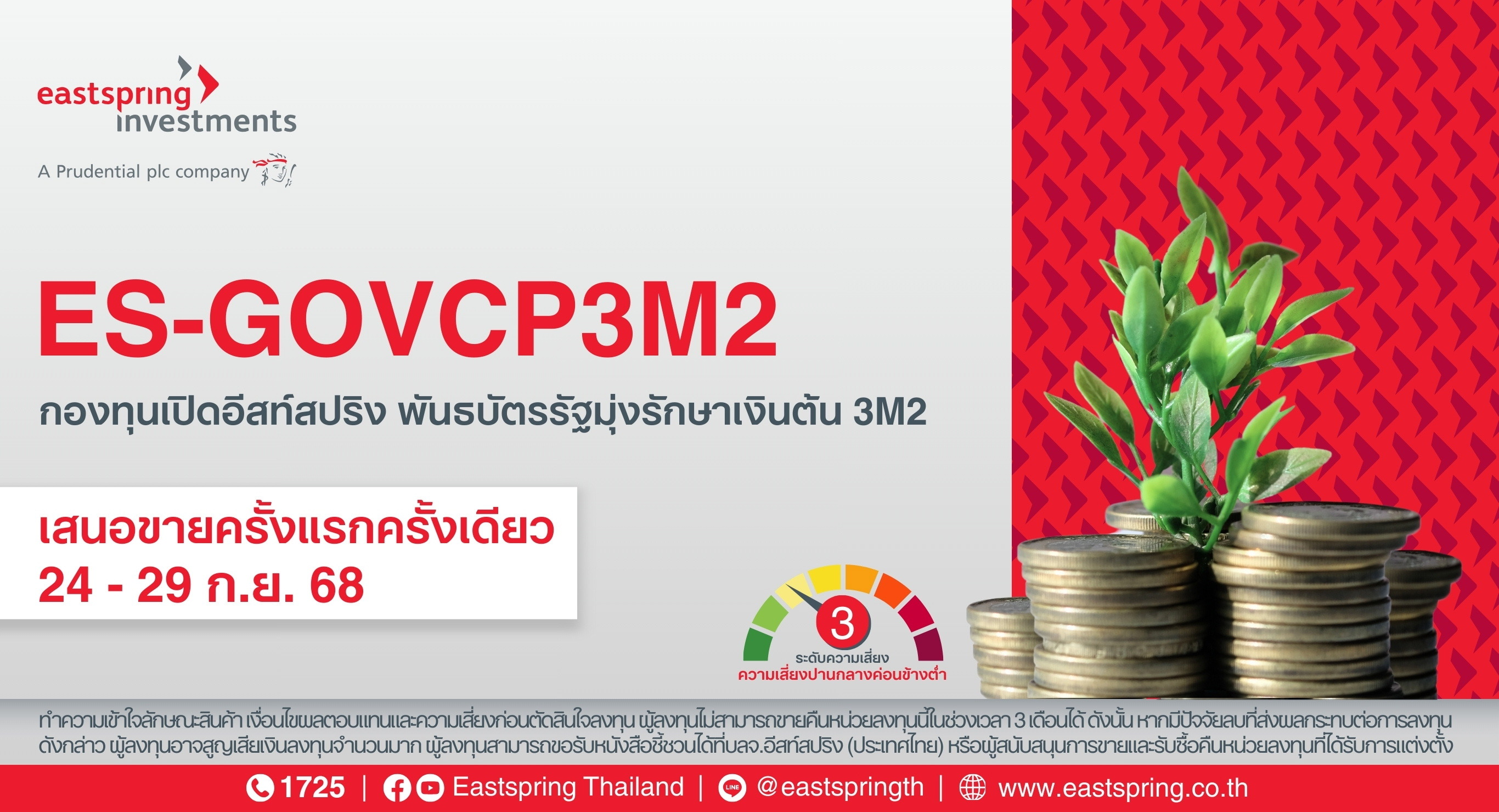 บริษัทหลักทรัพย์จัดการกองทุน อีสท์สปริง (ประเทศไทย) จำกัด หรือ บลจ.อีสท์สปริง เปิดเสนอขายกองทุนเปิดอีสท์สปริง พันธบัตรรัฐมุ่งรักษาเงินต้น 3M2 (ES-GOVCP3M2) อายุประมาณ 3 เดือน เงินทุนโครงการ 10,000 ล้านบาท ซึ่งเป็นกองทุนรวมตราสารหนี้ที่มุ่งรักษาเงินต้นที่ผู้ลงทุนจะมีโอกาสได้รับเงินต้นคืนเต็มจำนวน และมีโอกาสได้รับผลตอบแทนเพิ่มจากการเพิ่มขึ้นของมูลค่าหน่วยลงทุน ณ วันครบอายุโครงการ โดยเสนอขายครั้งแรกครั้งเดียวตั้งแต่วันที่ 24-29 กันยายน 2568 ด้วยเงินลงทุนขั้นต่ำเพียง 1,000 บาท