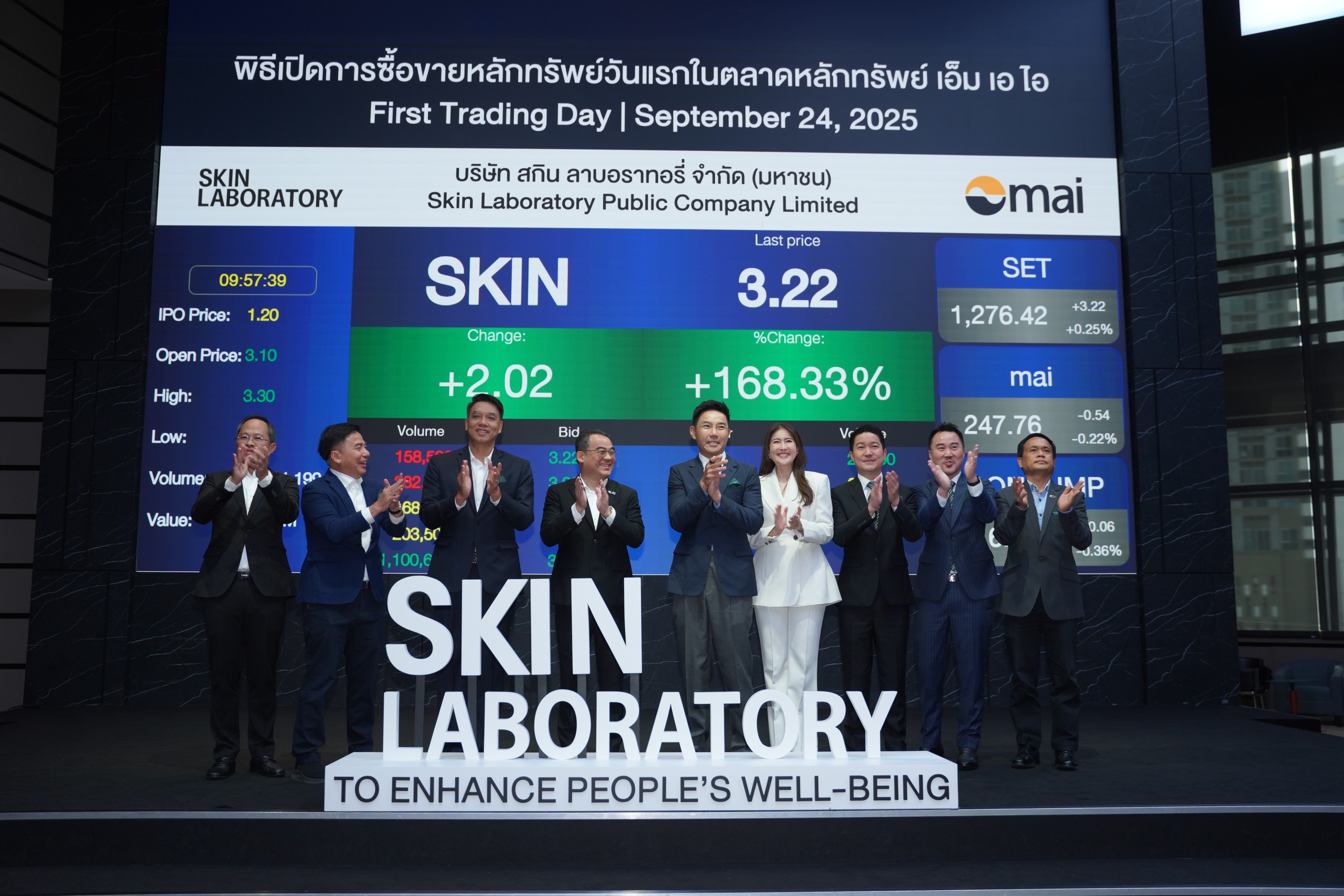 สรวิศ ไกรฤกษ์ รองผู้จัดการ ตลาดหลักทรัพย์แห่งประเทศไทย ประพันธ์ เจริญประวัติ ผู้จัดการตลาด หลักทรัพย์ เอ็ม เอ ไอ พร้อมด้วย ชาญวิทย์ เขียวนาวาวงศ์ษา ประธานเจ้าหน้าที่บริหาร บมจ. สกิน ลาบอราทอรี่ ร่วมพิธีเปิดการซื้อขายวันแรกในตลาดหลักทรัพย์ เอ็ม เอ ไอ ของ บมจ. สกิน ลาบอราทอรี่ ผู้คิดค้นพัฒนาและจำหน่ายผลิตภัณฑ์ด้านความงาม ภายใต้แบรนด์หลัก Skinsista และ Dermie ในวันที่ 24 กันยายน 2568 มูลค่าหลักทรัพย์ ณ ราคา IPO 172.80 ล้านบาท โดยใช้ชื่อย่อในการซื้อขายหลักทรัพย์ว่า “SKIN”
