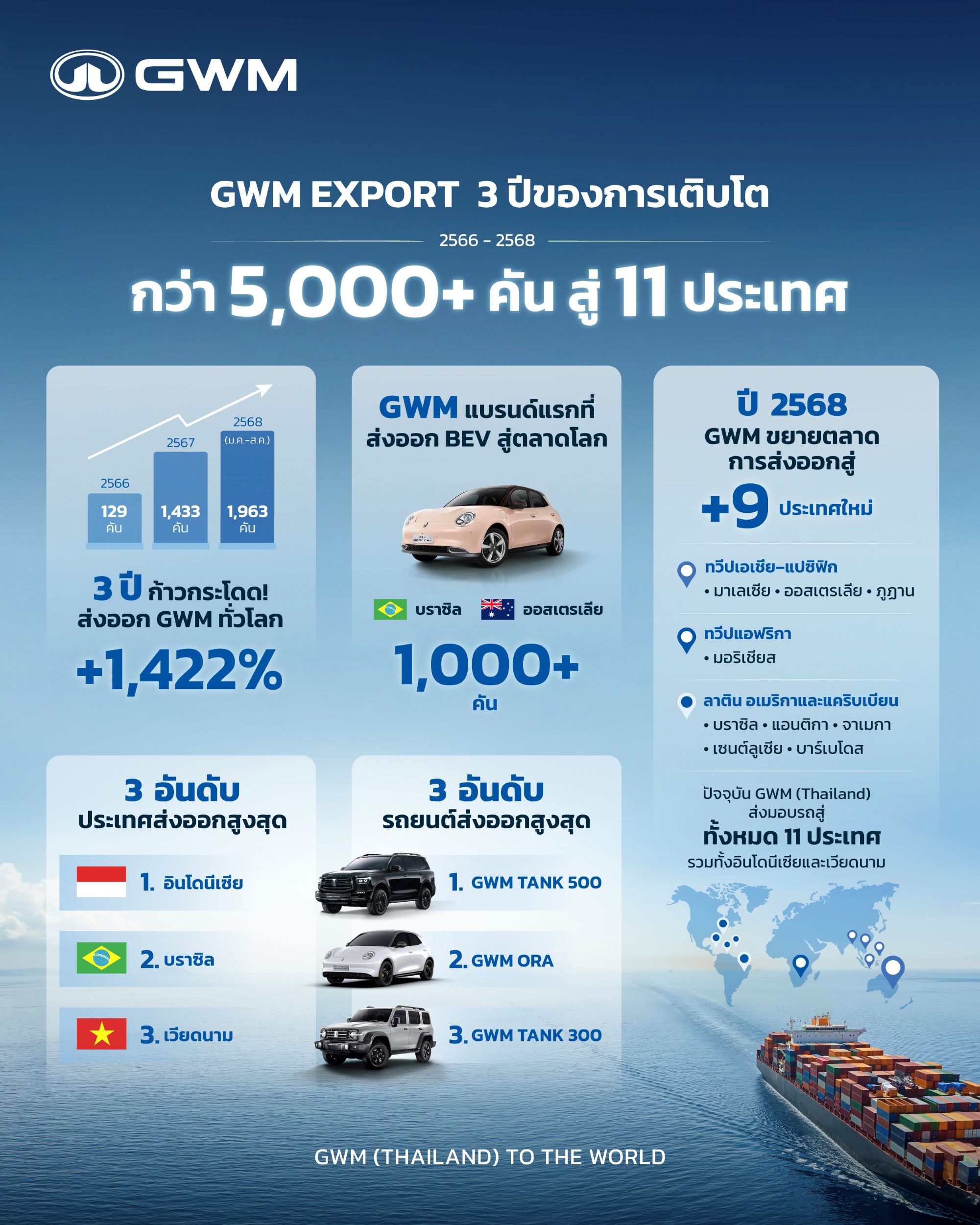 GWM เป็นแบรนด์แรกที่มีการผลิตเพื่อการส่งออกรถยนต์ไฟฟ้าออกสู่ตลาดโลก โดยมีการเริ่มส่งออก GWM ORA Good Cat ไปยังประเทศสำคัญ ๆ ตั้งแต่เดือนมีนาคมที่ผ่านมา ทั้งบราซิลและออสเตรเลีย ในจำนวนกว่า 1,000 คัน แสดงถึงศักยภาพของโรงงานอัจฉริยะ GWM Smart Factory ที่จังหวัดระยอง ในการตอบสนองความต้องการรถ EV ที่เติบโตอย่างรวดเร็ว ซึ่งสอดคล้องไปกับความต้องการรถยนต์พลังงานไฟฟ้า 100% ทั่วโลก โดยในต้นปี 2568 นั้น ตลาดรวมทั่วโลกมียอดขาย EV และ PHEV เพิ่มขึ้นกว่า 29% ขณะที่ไทยมียอดผลิต EV เพิ่มขึ้นกว่า 393.12% ในครึ่งปีแรก และรัฐบาลตั้งเป้าหมายให้ 30% ของการผลิตยานยนต์ทั้งหมดเป็น Zero Emission Vehicles ภายในปี 2573