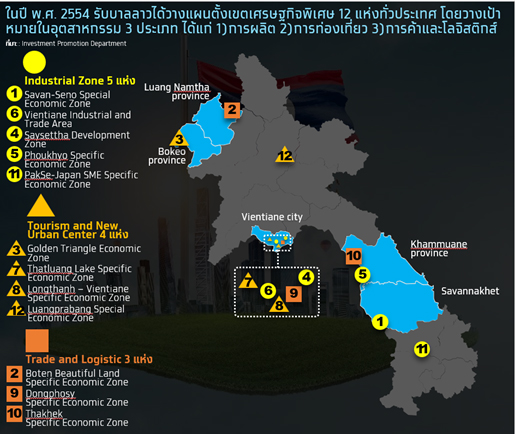 นับตั้งแต่ปี พ.ศ. 2554 เป็นต้นมา ลาวได้ดำเนินนโยบายส่งเสริมการลงทุนจากต่างประเทศผ่านการจัดตั้งเขตเศรษฐกิจพิเศษ (Special Economic Zone: SEZ) ซึ่งมีจำนวน 12 แห่ง กระจายอยู่ในพื้นที่ยุทธศาสตร์ทั่วประเทศลาว โดยมุ่งเน้นพัฒนาอุตสาหกรรม 3 ประเภทหลัก ได้แก่ 1)การผลิต 2)การท่องเที่ยว และ3)การค้าและโลจิสติกส์ ซึ่งเขตเศรษฐกิจพิเศษเหล่านี้ส่วนใหญ่กระจายตัวอยู่บริเวณชายแดนของประเทศ เช่น ภาคการค้าและโลจิสติกส์ตั้งอยู่ตรงชายแดนติดไทย จีน และเวียดนาม เพื่อใช้ประโยชน์จากการเชื่อมโยงทางการค้าและเครือข่ายขนส่งระหว่างประเทศ ภาคอุตสาหกรรมการผลิตตามแนวชายแดน ภาคท่องเที่ยวในพื้นที่ศักยภาพสูง ยกเว้นเพียงบางแห่ง เช่น เขตเศรษฐกิจพิเศษหลวงพระบาง ที่ตั้งอยู่ในพื้นที่ตอนในของประเทศ ซึ่งจากการวิเคราะห์ SEZ ทั้ง 12 แห่ง สามารถสรุปศักยภาพของพื้นที่ตามอุตสาหกรรม 3 ประเภทหลักที่มุ่งเน้นพัฒนาได้ดังนี้