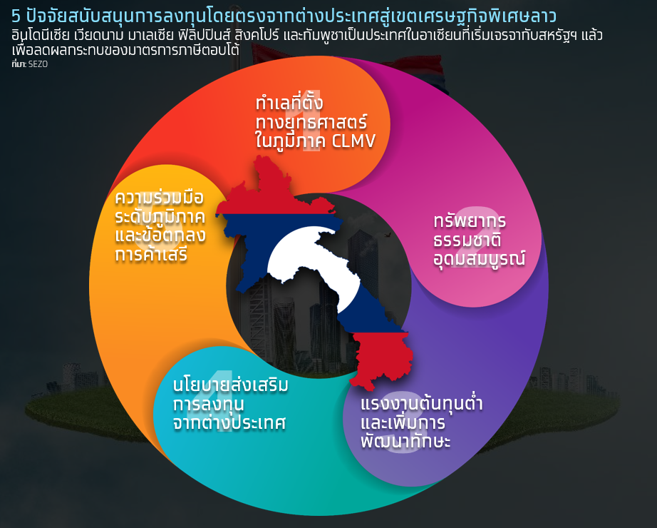 การลงทุนจากต่างประเทศในเขตเศรษฐกิจพิเศษของลาวได้รับความสนใจจากนักลงทุนต่างชาติเพิ่มขึ้นอย่างต่อเนื่อง โดยมี 5 ปัจจัยหลักที่สนับสนุนการลงทุน ได้แก่ 1) ทำเลที่ตั้งทางยุทธศาสตร์ โดยลาวตั้งอยู่ ใจกลางภูมิภาค CLMV (กัมพูชา ลาว เมียนมา เวียดนาม) และเชื่อมต่อกับจีนผ่านทางรถไฟลาว-จีน ทำให้เอื้อต่อการกระจายสินค้าไปยังภูมิภาค 2) ทรัพยากรธรรมชาติอุดมสมบูรณ์ เช่น พลังงานน้ำ แร่ธาตุ และพื้นที่เกษตรกรรม ซึ่งส่งเสริมการลงทุนในพลังงาน เหมืองแร่ และอุตสาหกรรมเกษตร 3) แรงงานต้นทุนต่ำ และมีนโยบายพัฒนาทักษะแรงงานผ่านความร่วมมือระหว่างประเทศ 4) นโยบายเปิดกว้างต่อการลงทุนจากต่างชาติ โดยเฉพาะสิทธิประโยชน์ด้านภาษี การถือครองกิจการ และสิทธิในทรัพย์สินทางธุรกิจในเขตเศรษฐกิจพิเศษ และ 5) การเชื่อมโยงทางการค้าผ่านการเป็นสมาชิกอาเซียน RCEP และ WTO ช่วยให้นักลงทุนเข้าถึงตลาดภูมิภาคขนาดใหญ่ด้วยต้นทุนภาษีที่ต่ำ ปัจจัยเหล่านี้ทำให้ลาวกลายเป็นหนึ่งในจุดหมายที่มีศักยภาพด้านการลงทุนในระดับภูมิภาค