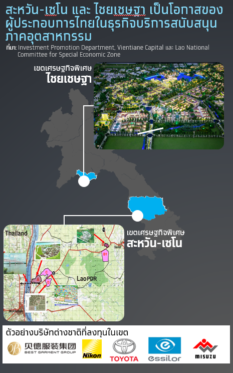 เขตเศรษฐกิจพิเศษสะหวัน-เซโน และเขตไชยเชษฐา ถือเป็น 2 พื้นที่ที่มีศักยภาพสูงในการรองรับการลงทุนในภาคอุตสาหกรรมการผลิต ซึ่งประเมินว่าเป็นโอกาสสำหรับผู้ประกอบการไทยในการเข้าไปมีบทบาทในกลุ่ม “ธุรกิจบริการสนับสนุนภาคอุตสาหกรรม” (Industrial supporting services) โดยมีลักษณะของกิจกรรมที่เกี่ยวข้องกับการจัดตั้งโรงงาน การผลิตเพื่อส่งออก และความต้องการด้านโครงสร้างพื้นฐานที่เกี่ยวข้อง ซึ่งประเมินว่าธุรกิจบริการสนับสนุนภาคอุตสาหกรรมที่เป็นโอกาสสำหรับผู้ประกอบการไทยมี 3 กลุ่มหลัก ได้แก่