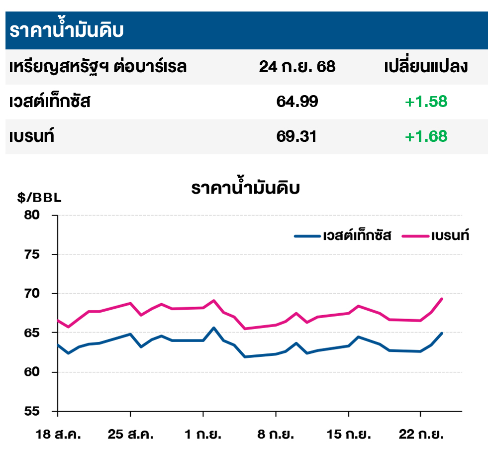 (+) ราคาน้ำมันดิบเวสต์เท็กซัสและเบรนท์ปรับเพิ่มขึ้นแตะระดับสูงสุดในรอบ 7 สัปดาห์ หลังสำนักงานสารสนเทศด้านพลังงานสหรัฐฯ (EIA) เปิดเผยตัวเลขนํ้ามันดิบคงคลังสหรัฐฯ ประจำสัปดาห์สิ้นสุด ณ วันที่ 19 ก.ย. 68 ปรับลดลง 0.61 ล้านบาร์เรล สู่ระดับ 414.8 ล้านบาร์เรล สวนทางกับที่นักวิเคราะห์คาดการณ์ว่าจะปรับเพิ่มขึ้น 0.24 ล้านบาร์เรล โดยการปรับลดดังกล่าว สร้างความกังวลต่อตลาดเกี่ยวกับอุปทานที่ตึงตัวท่ามกลางปัญหาการส่งออกน้ำมันในอิรัก เวเนซุเอลา และรัสเซีย