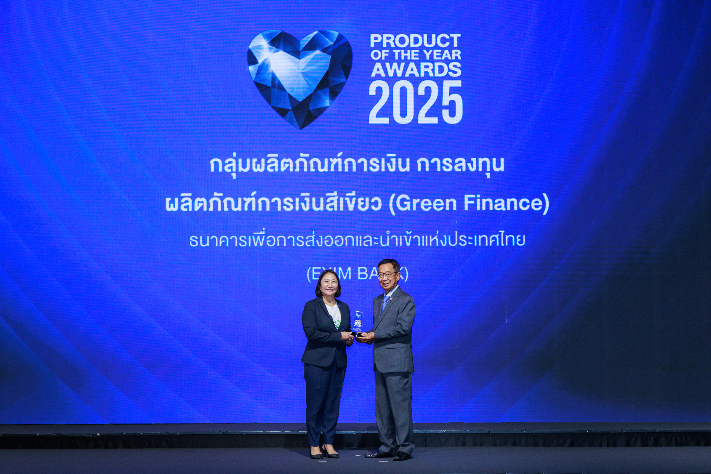 นางสาวดรัสวันต์ ชูวงษ์ ผู้ช่วยกรรมการผู้จัดการ ธนาคารเพื่อการส่งออกและนำเข้าแห่งประเทศไทย (EXIM BANK) รับรางวัลสุดยอดสินค้าและบริการแห่งปี กลุ่มการเงิน-การลงทุน ประเภทผลิตภัณฑ์การเงินสีเขียวจากนายนุรักษ์ มาประณีต องคมนตรี ในงาน BUSINESS+ Product of the Year Awards 2025 จัดโดยนิตยสาร Business+ ร่วมกับวิทยาลัยการจัดการ มหาวิทยาลัยมหิดล ณ โรงแรมสวิสโฮเต็ล กรุงเทพฯ เมื่อวันที่ 25 กันยายน 2568 โดย EXIM BANK มุ่งพัฒนาผลิตภัณฑ์ทางการเงินสีเขียว เพื่อช่วยผู้ประกอบการไทยปรับตัวและเพิ่มขีดความสามารถในการแข่งขันในตลาดโลก ดำเนินธุรกิจสอดคล้องกับมาตรฐานสิ่งแวดล้อมสากล ขับเคลื่อนประเทศไทยและโลกสู่สังคมคาร์บอนต่ำอย่างยั่งยืน