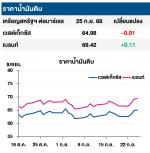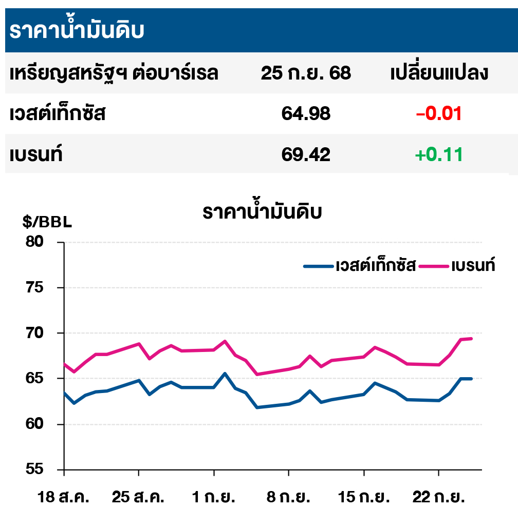 (-) ราคาน้ำมันดิบเบรนท์ปรับเพิ่มขึ้นเล็กน้อย ขณะที่ราคาน้ำมันดิบเวสต์เท็กซัสทรงตัว หลังตัวเลขผลิตภัณฑ์มวลรวมภายในประเทศ (GDP) ของสหรัฐฯ ในไตรมาสล่าสุดปรับเพิ่มขึ้นเป็นร้อยละ 3.8 ต่อปี ส่งผลให้ตลาดลดความคาดหวังต่อการปรับลดอัตราดอกเบี้ยเพิ่มเติมจาก Fed หลังจากได้มีการปรับลดอัตราดอกเบี้ยครั้งแรกกว่าร้อยละ 0.25 เมื่อสัปดาห์ที่ผ่านมา