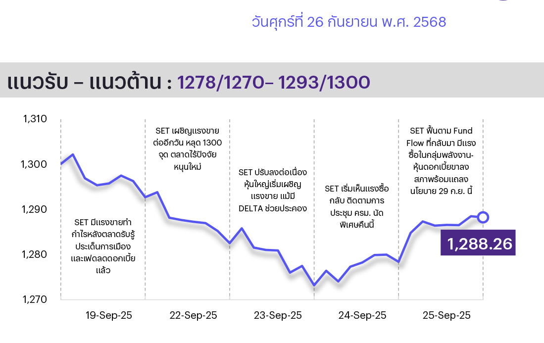 คาดตลาดแกว่งไซด์เวย์ นักลงทุนต่างชาติซื้อสุทธิต่อ แต่ลดระดับลง นายกฯ กล่าวหลังพบ FETCO ว่าจะทำสิ่งที่ทางตลาดทุนฯ ร้องขอมาให้สำเร็จ 3-4 เรื่องเป็นปัจจัยหนุนในระยะกลาง โดยการแถลงต่อสภาจะเริ่มในวันที่ 29 ก.ย. นี้ และนโยบายใกล้เคียงกับที่มีข่าวออกไปก่อนหน้านี้ ทางเทคนิค ตลาดรีบาวด์ต่อเนื่อง 2 วัน ยังให้ติดตามที่ 1283/1293 หากยืนเหนือได้จึงจะกลับมาเป็นบวก หากยังยืนไม่ได้ยังแกว่งพักตัว การลงมีแนวรับที่ไม่ควรลงหลุดต่ำกว่าที่ 1278/1270 ต่ำกว่าจะลงรอบใหม่