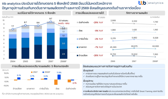 ศูนย์วิเคราะห์เศรษฐกิจ ทีทีบี หรือ ttb analytics คาดการณ์ปี 2568 รายได้เกษตรกร 5 พืชหลักลดลงราว 16% ที่รายได้รวมกว่า 8.1 แสนล้านบาท จากสภาพอากาศที่เอื้ออำนวยให้ปริมาณผลผลิตทางการเกษตรมีทิศทางเพิ่มขึ้น เกิดปัญหาอุปทานส่วนเกิน กดดันราคาสินค้าให้ตกต่ำ ในขณะที่แนวโน้มการระบายอุปทานส่วนเกินผ่านการส่งออกยังมองไม่เห็นสัญญาณบวก และคาดว่าสถานการณ์ดังกล่าวอาจส่งผลกระทบต่อเนื่องยาวถึงปี 2569 แนะภาครัฐเร่งจัดการปัญหาผลผลิตส่วนเกิน ทั้งในฝั่งอุปสงค์สำหรับเร่งหาช่องทางส่งออกสินค้าในพื้นที่ตลาดใหม่ๆ และฝั่งอุปทานในแง่การปรับปรุงทบทวนนโยบายให้มีความเหมาะสมและรัดกุมมากขึ้นควบคู่กันไป