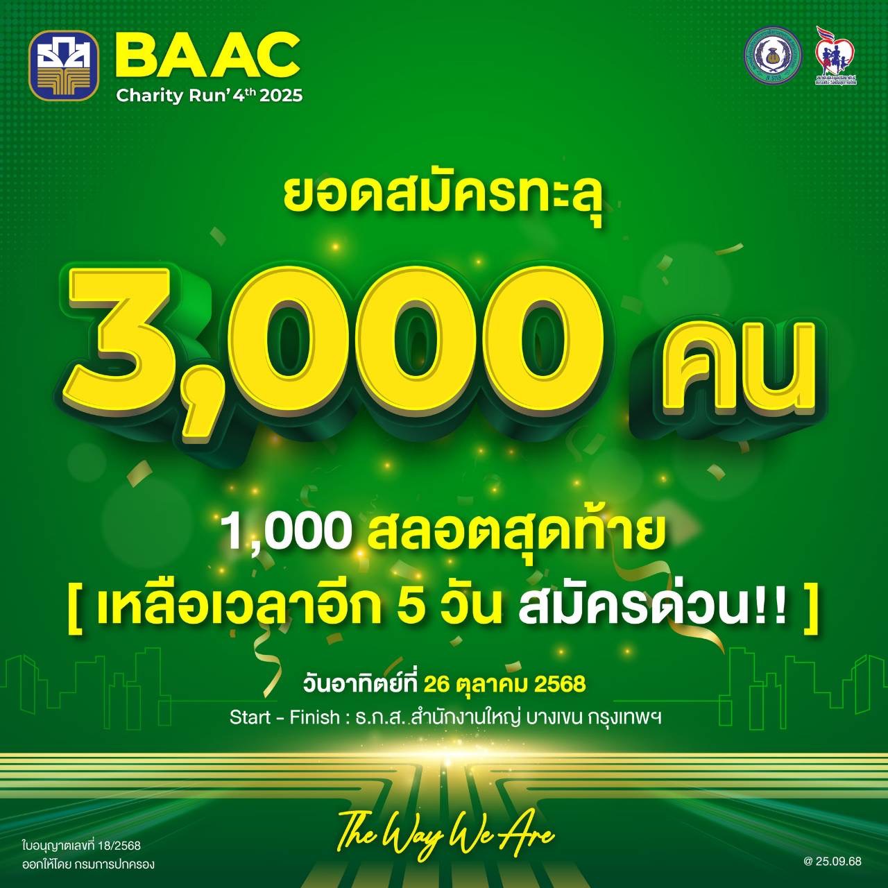 ?ธนาคารเพื่อการเกษตรและสหกรณ์การเกษตร(ธ.ก.ส.) ชวนทุกท่านสมัครเข้าร่วมงานวิ่งครั้งใหญ่แห่งปี BAAC Charity Run 4th 2025 ซึ่งจัดขึ้นเป็นครั้งที่ 4 โดยสมาคมสโมสรพนักงานธนาคารเพื่อการเกษตรและสหกรณ์การเกษตร(ส.ธกส.) ในวันอาทิตย์ที่ 26 ตุลาคม 2568 จุด Start และ Finish ที่ ธ.ก.ส. สำนักงานใหญ่ บางเขน กรุงเทพฯ และวิ่งบนเส้นทางถนนพหลโยธิน - ถนนประเสริฐมนูกิจ โดยหลังจากเปิดรับสมัครตั้งแต่วันที่ 1 กันยายน 2568 ล่าสุด ณ วันที่ 26 กันยายน 2568 มีนักวิ่งทั้งชาวไทยและชาวต่างชาติสมัครเข้าร่วมงานวิ่งสุดมันส์ รางวัลสุดยิ่งใหญ่แล้วมากกว่า 3,000 รายแล้ว!! แบ่งการสมัครออกเป็น 2 ระยะ ได้แก่ ระยะ Fun Run 5 กิโลเมตร และระยะ Mini Marathon 10.5 กิโลเมตร ค่าสมัครเพียง 600 บาท และ VIP ค่าสมัคร 1,000 บาท ผู้สมัครยังได้รับของที่ระลึก เสื้อวิ่ง BIB กระเป๋า Shopping bag และรับเหรียญรางวัลทันทีเมื่อเข้าเส้นชัยภายในระยะเวลาที่กำหนด พิเศษ!! เหรียญรางวัลปีนี้ถูกออกแบบมาให้สามารถเชื่อมต่อกับเหรียญรางวัลของงาน BAAC Charity Run ปี 2023 และ 2024 ได้อีกด้วย ทั้งนี้ รายได้จากค่าสมัครทั้งหมดจะนำไปมอบเป็นทุนการศึกษาให้แก่ทายาทของเกษตรกร