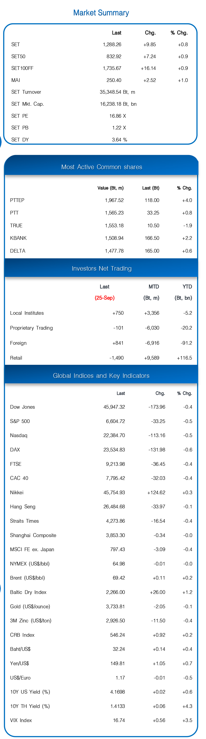 อ่อนตัวลง – ทิศทางหุ้นโลกและทรัมป์จะขึ้นภาษียา 100% เริ่ม 1 ต.ค.นี้ เป็นบรรยากาศเชิงลบต่อการลงทุน นอกจากนี้ดอลล์ที่แข็งค่าขึ้นต่อกดดันบาทอ่อนสุดในรอบ 3 สัปดาห์ แตะ 32.2 บ./$ อาจกระทบต่อ Fund Flowsจากนี้ดอลล์ที่แข็งค่าขึ้นต่อกดดันบาทอ่อนสุดในรอบ 3 สัปดาห์ แตะ 32.2 บ./$ อาจกระทบต่อ Fund Flows ขณะที่รัฐบาลอนุทินเตรียมแถลงนโยบายต่อสภา 29-30 ก.ย. นี้ แนวรับ 1280, 1270+/- แนวต้าน 1290, 1300-1305