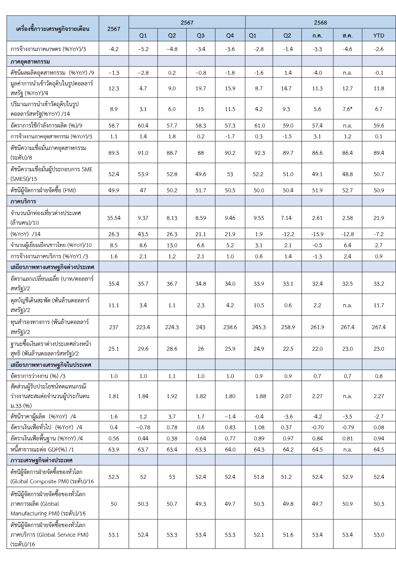 5. เครื่องชี้เศรษฐกิจไทยด้านอุปทาน โดยเฉพาะบริการด้านการท่องเที่ยวจากนักท่องเที่ยวต่างชาติชะลอตัว ขณะที่การท่องเที่ยวภายในประเทศยังคงขยายตัวจากช่วงเดียวกันปีก่อน: โดยภาคบริการด้านการท่องเที่ยว ในเดือนสิงหาคม 2568 มีนักท่องเที่ยวชาวต่างชาติที่เดินทางเข้าประเทศไทยรวม จำนวน 2.58 ล้านคน ลดลงจากช่วงเดียวกันปีก่อนที่ร้อยละ -12.8 และลดลง เมื่อเทียบกับเดือนก่อนหน้าหลังขจัดผลทางฤดูกาลที่ร้อยละ -1.0 ขณะที่การท่องเที่ยวภายในประเทศมีผู้เยี่ยมเยือนชาวไทย ในเดือนสิงหาคม 2568 จำนวน 22.4 ล้านคน เพิ่มขึ้นจากช่วงเดียวกันปีก่อนที่ร้อยละ 6.4 และเพิ่มขึ้นเมื่อเทียบกับเดือนก่อนหน้าหลังขจัดผลทางฤดูกาลที่ร้อยละ 2.4 ขณะที่ภาคการเกษตร สะท้อนจากดัชนีผลผลิตสินค้าเกษตร ในเดือนสิงหาคม 2568 เพิ่มขึ้นจากช่วงเดียวกันปีก่อนที่ร้อยละ 0.6 แต่ลดลงเมื่อเทียบกับเดือนก่อนหน้าหลังขจัดผลทางฤดูกาลที่ร้อยละ -5.7 ตามการเพิ่มขึ้นในหมวดพืชผลสำคัญ อาทิ ยางพารา มันสำปะหลัง และข้าวโพด เป็นต้น อย่างไรก็ดี ผลผลิตมันสำปะหลัง และหมวดไม้ผล ลดลงจากเดือนก่อน สำหรับภาคอุตสาหกรรม สะท้อนจากดัชนีความเชื่อมั่นภาคอุตสาหกรรม ในเดือนสิงหาคม 2568 ปรับตัวลดลงมาอยู่ที่ระดับ 86.4 จากระดับ 86.6 ในเดือนก่อนหน้า โดยได้รับปัจจัยกดดันจากความขัดแย้งในพื้นที่ชายแดน ปัญหาอุทกภัย และความไม่ชัดเจนของอัตราภาษีสหรัฐฯ ขณะที่ดัชนีผู้จัดการฝ่ายจัดซื้อของไทย ในเดือนสิงหาคม 2568 ปรับตัวเพิ่มขึ้นมาอยู่ที่ระดับ 52.7 จากระดับ 51.9 ในเดือนก่อนหน้า โดยได้รับปัจจัยสนับสนุนจากคำสั่งซื้อสินค้าที่เพิ่มขึ้น