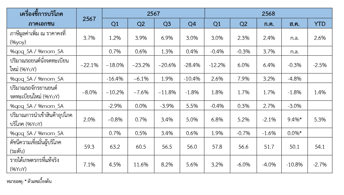 1. เครื่องชี้เศรษฐกิจด้านการบริโภคภาคเอกชน มีสัญญาณชะลอลงจากช่วงเดียวกันปีก่อน โดยเฉพาะการบริโภคในหมวดสินค้าคงทน: โดยปริมาณรถจักรยานยนต์จดทะเบียนใหม่และปริมาณรถยนต์นั่งจดทะเบียนใหม่ ในเดือนสิงหาคม 2568 ลดลงจากช่วงเดียวกันปีก่อนร้อยละ -1.8 และ -0.3 ตามลำดับ และลดลงเมื่อเทียบกับเดือนก่อนหน้าหลังขจัดผลทางฤดูกาลที่ร้อยละ -3.0 และ -4.8 ตามลำดับ ขณะที่รายได้เกษตรกรที่แท้จริง ในเดือนสิงหาคม 2568 ลดลงจากช่วงเดียวกันปีก่อนที่ร้อยละ -10.8 และดัชนีความเชื่อมั่นผู้บริโภค ในเดือนสิงหาคม 2568 ปรับตัวลดลงมาอยู่ที่ระดับ 50.1 จากระดับ 51.7 ในเดือนก่อนหน้า เนื่องจากสถานการณ์เศรษฐกิจโดยรวมยังคงฟื้นตัวช้า และค่าครองชีพสูง รวมถึงความกังวลต่อสถานการณ์ความขัดแย้งทางภูมิรัฐศาสตร์