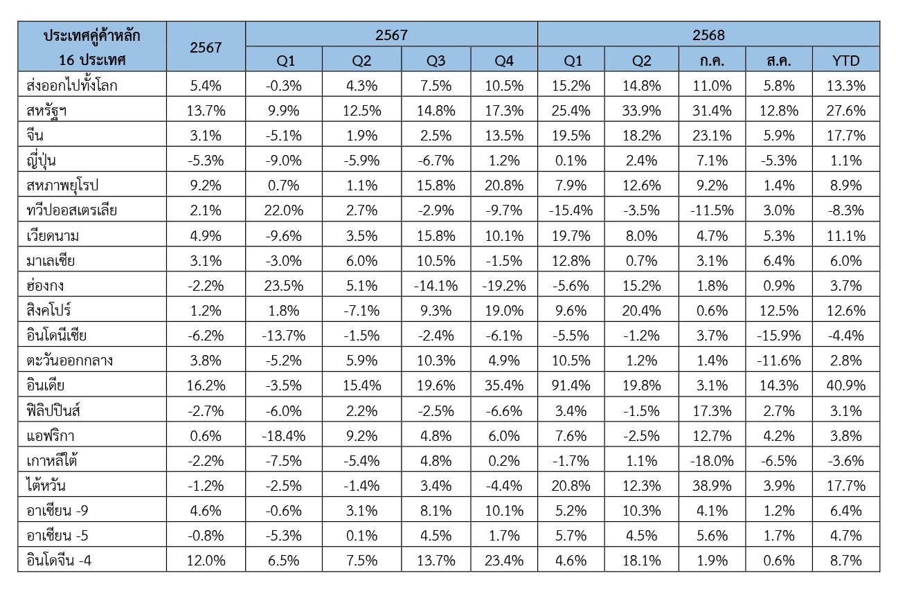 มูลค่าการส่งออกสินค้าขยายตัวจากช่วงเดียวกันปีก่อน: โดยมูลค่าการส่งออกสินค้ารวมในรูปเงินสกุลดอลลาร์สหรัฐ ในเดือนสิงหาคม 2568 อยู่ที่ 27,743.2 ล้านดอลลาร์สหรัฐ เพิ่มขึ้นจากช่วงเดียวกันปีก่อนต่อเนื่องเป็นเดือนที่ 14 ที่ร้อยละ 5.8 และหากพิจารณาเฉพาะมูลค่าการส่งออกสินค้าที่ไม่รวมน้ำมันและสินค้าที่เกี่ยวเนื่อง ทองคำ และยุทธปัจจัย พบว่า ขยายตัวที่ร้อยละ 5.4 การส่งออกขยายตัวในอัตราชะลอลง หลังจากมีการบังคับใช้อัตราภาษีศุลกากรตอบโต้ของสหรัฐฯ อย่างไรก็ดี ยังเห็นการขยายตัวของสินค้าในหมวดเครื่องคอมพิวเตอร์ อุปกรณ์และส่วนประกอบ แผงวงจรไฟฟ้า และเครื่องจักรกลและส่วนประกอบ โดยขยายตัวร้อยละ 44.1 37.0 และ 10.2 ตามลำดับ นอกจากนี้ การส่งออกผลิตภัณฑ์ข้าวสาลีและอาหารสำเร็จรูปอื่น ๆ กุ้งสด แช่เย็น แช่แข็ง และไก่สด แช่เย็น แช่แข็ง ขยายตัวร้อยละ 26.1 7.0 และ 1.3 ตามลำดับ ในขณะที่การส่งออกข้าว ยางพารา และสินค้าที่เกี่ยวเนื่องกับน้ำมัน ปรับตัวลดลง ทั้งนี้ เมื่อพิจารณามูลค่าการส่งออกสินค้า โดยจำแนกเป็นรายตลาดคู่ค้าหลักของไทย พบว่า ปรับตัวเพิ่มขึ้นในตลาดอินเดีย สหรัฐฯ และจีน ขยายตัวจากช่วงเดียวกันปีก่อนที่ร้อยละ 14.3 12.8 และ 5.9 ตามลำดับ อย่างไรก็ดี ตลาดตะวันออกกลาง และญี่ปุ่น ลดลงร้อยละ -11.6 และ -5.3