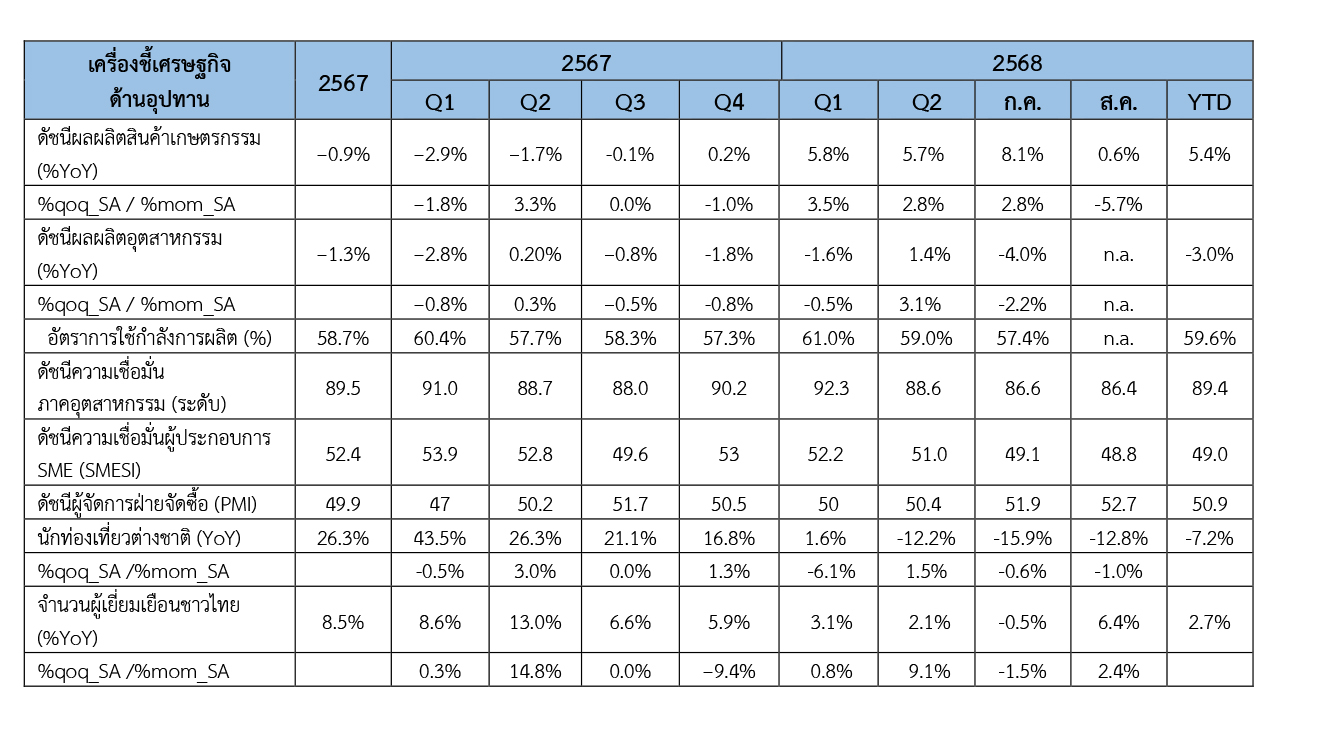 เครื่องชี้เศรษฐกิจไทยด้านอุปทาน โดยเฉพาะบริการด้านการท่องเที่ยวจากนักท่องเที่ยวต่างชาติชะลอตัว ขณะที่การท่องเที่ยวภายในประเทศยังคงขยายตัวจากช่วงเดียวกันปีก่อน: โดยภาคบริการด้านการท่องเที่ยว ในเดือนสิงหาคม 2568 มีนักท่องเที่ยวชาวต่างชาติที่เดินทางเข้าประเทศไทยรวม จำนวน 2.58 ล้านคน ลดลงจากช่วงเดียวกันปีก่อนที่ร้อยละ -12.8 และลดลง เมื่อเทียบกับเดือนก่อนหน้าหลังขจัดผลทางฤดูกาลที่ร้อยละ -1.0 ขณะที่การท่องเที่ยวภายในประเทศมีผู้เยี่ยมเยือนชาวไทย ในเดือนสิงหาคม 2568 จำนวน 22.4 ล้านคน เพิ่มขึ้นจากช่วงเดียวกันปีก่อนที่ร้อยละ 6.4 และเพิ่มขึ้นเมื่อเทียบกับเดือนก่อนหน้าหลังขจัดผลทางฤดูกาลที่ร้อยละ 2.4 ขณะที่ภาคการเกษตร สะท้อนจากดัชนีผลผลิตสินค้าเกษตร ในเดือนสิงหาคม 2568 เพิ่มขึ้นจากช่วงเดียวกันปีก่อนที่ร้อยละ 0.6 แต่ลดลงเมื่อเทียบกับเดือนก่อนหน้าหลังขจัดผลทางฤดูกาลที่ร้อยละ -5.7 ตามการเพิ่มขึ้นในหมวดพืชผลสำคัญ อาทิ ยางพารา มันสำปะหลัง และข้าวโพด เป็นต้น อย่างไรก็ดี ผลผลิตมันสำปะหลัง และหมวดไม้ผล ลดลงจากเดือนก่อน สำหรับภาคอุตสาหกรรม สะท้อนจากดัชนีความเชื่อมั่นภาคอุตสาหกรรม ในเดือนสิงหาคม 2568 ปรับตัวลดลงมาอยู่ที่ระดับ 86.4 จากระดับ 86.6 ในเดือนก่อนหน้า โดยได้รับปัจจัยกดดันจากความขัดแย้งในพื้นที่ชายแดน ปัญหาอุทกภัย และความไม่ชัดเจนของอัตราภาษีสหรัฐฯ ขณะที่ดัชนีผู้จัดการฝ่ายจัดซื้อของไทย ในเดือนสิงหาคม 2568 ปรับตัวเพิ่มขึ้นมาอยู่ที่ระดับ 52.7 จากระดับ 51.9 ในเดือนก่อนหน้า โดยได้รับปัจจัยสนับสนุนจากคำสั่งซื้อสินค้าที่เพิ่มขึ้น