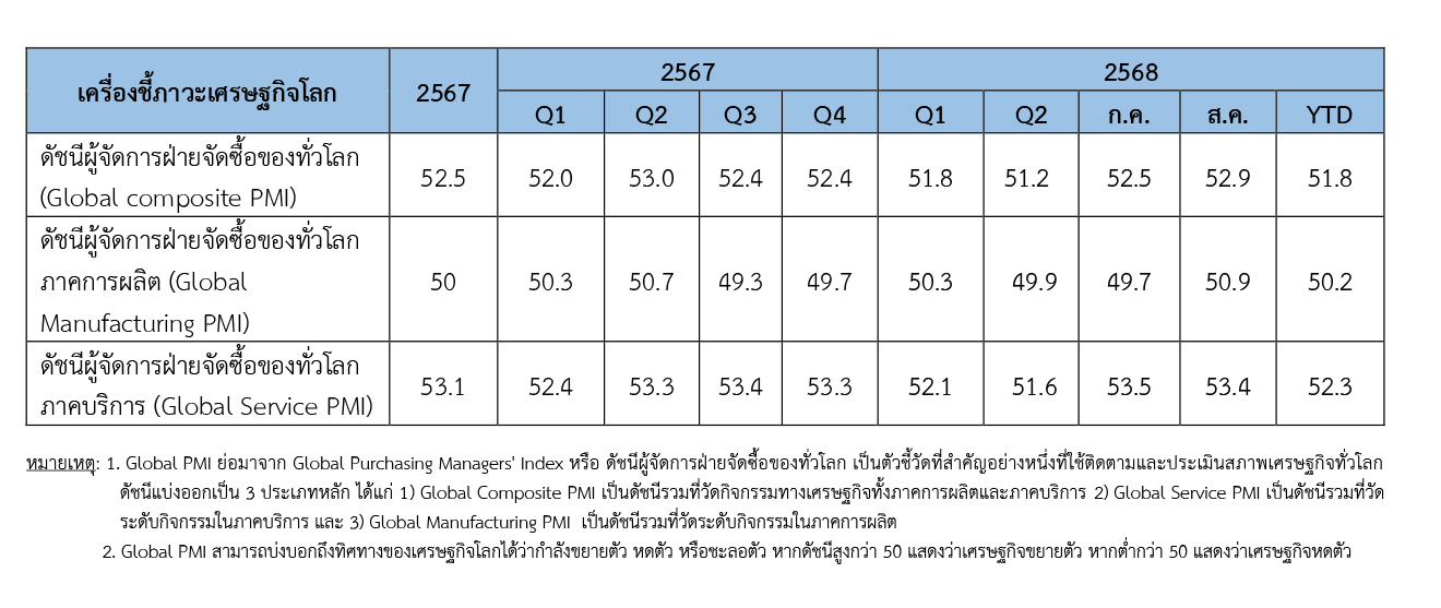 7. สถานการณ์เศรษฐกิจการเงินโลกปรับตัวดีขึ้นจากเดือนก่อนหน้า: สะท้อนจาก ดัชนีผู้จัดการฝ่ายจัดซื้อของทั่วโลก (Global Composite PMI) ในเดือนสิงหาคม 2568 อยู่ที่ระดับ 52.9 จุด เพิ่มขึ้นจากเดือนก่อนหน้าที่ 52.5 จุด และดัชนีอยู่สูงกว่าระดับ 50.0 จุด บ่งชี้ว่าเศรษฐกิจโลกมีทิศทางขยายตัวเร่งขึ้น ดัชนีผู้จัดการฝ่ายจัดซื้อของทั่วโลกภาคการผลิต (Global Manufacturing PMI) ในเดือนสิงหาคม 2568 ปรับเพิ่มขึ้นมาอยู่ที่ระดับ 50.9 จุด จากระดับ 49.7 จุด ในเดือนก่อนหน้า โดยดัชนีกลับมาขยายตัวอีกครั้งหลังจากหดตัวในเดือนก่อนหน้า จากปริมาณการผลิต ปริมาณคำสั่งซื้อใหม่และการจ้างงานที่เพิ่มขึ้น เป็นสำคัญ ขณะที่ดัชนีผู้จัดการฝ่ายจัดซื้อของทั่วโลกภาคบริการ (Global Service PMI) ในเดือนสิงหาคม 2568 อยู่ที่ระดับ 53.4 จุด ปรับลดลงเล็กน้อยจากเดือนก่อนหน้าที่อยู่ที่ระดับ 53.5 จุด แต่ยังอยู่สูงกว่าระดับ 50 จุด บ่งชี้ทิศทางการขยายตัวต่อเนื่องของภาคบริการเป็นเดือนที่ 32 ติดต่อกัน ด้านสถานการณ์การท่องเที่ยวทั่วโลกยังคงขยายตัวดีในหลายประเทศ ด้านอัตราดอกเบี้ยนโยบายของประเทศต่าง ๆ มีทิศทางปรับลดลงตามอัตราเงินเฟ้อในหลายประเทศที่อยู่ในระดับต่ำ รวมทั้ง ทิศทางการปรับลดดอกเบี้ยนโยบายของธนาคารกลางสหรัฐฯ สถานการณ์ดังกล่าวส่งผลให้ความตึงตัวในตลาดการเงินทั่วโลกเริ่มมีทิศทางที่ผ่อนคลายลง ในส่วนของสถานการณ์ความขัดแย้งทางภูมิรัฐศาสตร์ยังคงต้องติดตามอย่างต่อเนื่อง ภายใต้สถานการณ์ที่ยังมีความไม่แน่นอนสูง