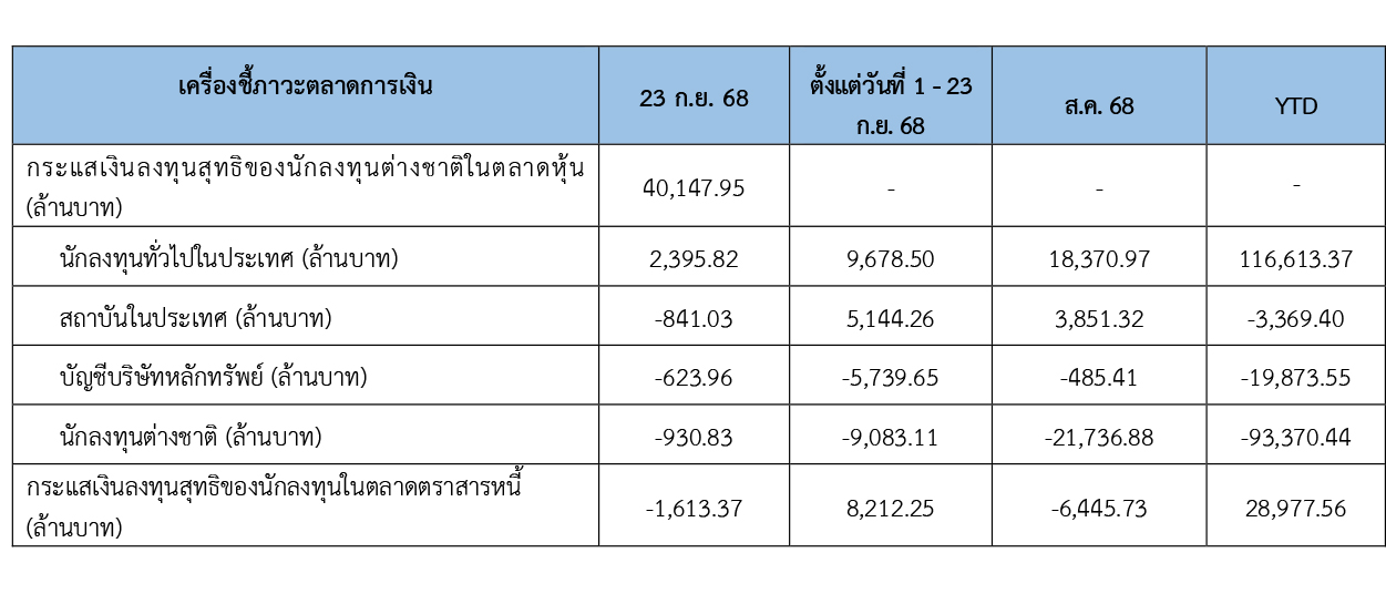ภาพรวมภาวะตลาดการเงินไทยล่าสุด เริ่มมีสัญญาณฟื้นตัวบางส่วน: โดยเฉพาะในตลาดทุน โดยได้รับแรงสนับสนุนจากกลุ่มนักลงทุนบุคคลทั่วไปในประเทศ โดยในเดือนกันยายน (ข้อมูลสะสมถึงวันที่ 23 กันยายน 2568) นักลงทุนกลุ่มนี้ซื้อสุทธิรวม 9,678.50 ล้านบาท จากในเดือนสิงหาคมซื้อสุทธิสูงถึง 18,370.97 ล้านบาท ส่งผลให้ยอดซื้อสุทธิสะสมตั้งแต่ต้นปี (YTD) อยู่ในระดับสูงที่ 116,613.37 ล้านบาท สะท้อนถึงความเชื่อมั่นของนักลงทุนรายย่อยต่อการลงทุนในตลาดหุ้นไทย ขณะที่กลุ่มสถาบันในประเทศ กลับมาซื้อสุทธิในเดือนกันยายน 5,144.26 ล้านบาท ต่อเนื่องจากเดือนสิงหาคมที่ซื้อสุทธิ 3,851.32 ล้านบาท ส่วนบัญชีบริษัทหลักทรัพย์ ยังคงมียอดขายสุทธิในเดือนกันยายน –5,739.65 ล้านบาท ส่งผลให้ยอดขายสุทธิสะสมตั้งแต่ต้นปีอยู่ที่ –19,873.55 ล้านบาท ด้านนักลงทุนต่างชาติ แม้ยังคงขายสุทธิในตลาดหุ้นไทย –9,083.11 ล้านบาท ในเดือนกันยายน แต่แรงขายเริ่มลดลงเมื่อเทียบกับเดือนสิงหาคมที่สูงถึง –21,736.88 ล้านบาท อย่างไรก็ดี เมื่อพิจารณายอดสะสมตั้งแต่ต้นปี นักลงทุนต่างชาติยังเป็นผู้ขายสุทธิในระดับสูงที่ –93,370.44 ล้านบาท สำหรับตลาดตราสารหนี้ พบว่านักลงทุนต่างชาติกลับมาซื้อสุทธิ 8,212.25 ล้านบาท ในเดือนกันยายน หลังจากที่เดือนสิงหาคมขายสุทธิ –6,445.73 ล้านบาท ส่งผลให้ยอดซื้อสุทธิสะสมตั้งแต่ต้นปีอยู่ในระดับสูงที่ 28,977.56 ล้านบาท ซึ่งบ่งชี้ถึงความเชื่อมั่นต่อเสถียรภาพด้านการคลังและพันธบัตรรัฐบาลไทยในฐานะสินทรัพย์ปลอดภัย ท่ามกลาง