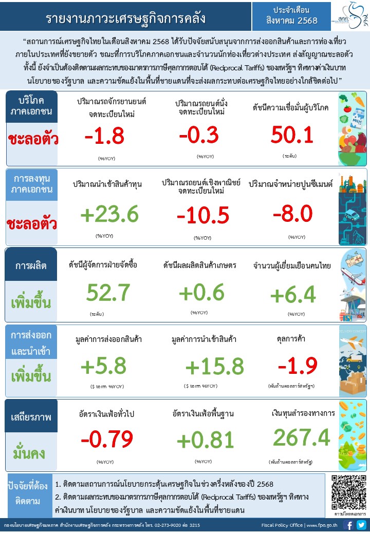 “สถานการณ์เศรษฐกิจไทยในเดือนสิงหาคม 2568 ได้รับปัจจัยสนับสนุนจากการส่งออกสินค้าและการท่องเที่ยวภายในประเทศที่ยังขยายตัว ขณะที่การบริโภคภาคเอกชนและจำนวนนักท่องเที่ยวต่างประเทศ ส่งสัญญาณชะลอตัว ทั้งนี้ ยังจำเป็นต้องติดตามผลกระทบของมาตรการภาษีศุลกากรตอบโต้ (Reciprocal Tariffs) ของสหรัฐฯ ทิศทางค่าเงินบาท นโยบายของรัฐบาล และความขัดแย้งในพื้นที่ชายแดนที่จะส่งผลกระทบต่อเศรษฐกิจไทยอย่างใกล้ชิดต่อไป”