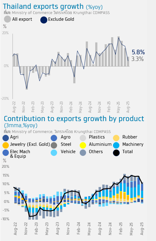 มูลค่าส่งออกเดือน ส.ค. อยู่ที่ 27,743.2 ล้านดอลลาร์ฯ เติบโต 5.8%YoY ชะลอตัวจาก 11.0%YoY เมื่อเดือนก่อน โดยการส่งออกสินค้ากลุ่มสินค้าอุตสาหกรรมขยายตัวต่อเนื่อง สวนทางกับสินค้าเกษตรและอุตสาหกรรมเกษตรที่กลับมาหดตัวเป็นครั้งแรกในรอบ 4 เดือน สำหรับการส่งออกทองคำในเดือนนี้กลับมาขยายตัว 144.0%YoY หลังหดตัวในเดือนก่อน ทำให้เมื่อหักทองคำแล้วมูลค่าส่งออกเดือนนี้ขยายตัวได้ 3.3%YoY โดยมีแรงขับเคลื่อนที่สำคัญจาก