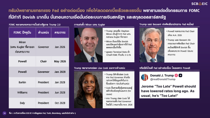 นโยบายการคลังและนโยบายการเงินจะมีบทบาทพยุงเศรษฐกิจโลกมากขึ้น โดยเฉพาะเศรษฐกิจหลัก เช่น จีนขาดดุลงบประมาณสูงขึ้นมาก ยุโรปคลายข้อจำกัดทางการคลังเพื่อเพิ่มงบประมาณแก้ปัญหาเศรษฐกิจ อย่างไรก็ดี การขาดดุลการคลังอาจเพิ่มความเสี่ยงทางการคลังที่มีอยู่ก่อนแล้วในหลายประเทศ สำหรับนโยบายการเงิน นับตั้งแต่ต้นปี 2568 ธนาคารกลางสหรัฐฯ ลดดอกเบี้ยแล้ว 25 bps และมีแนวโน้มลดเพิ่มอีก 100 bps ในช่วงที่เหลือของปี 2568 – ปี 2569 เพื่อพยุงตลาดแรงงานที่แย่ลงเร็ว แม้ยังมีความเสี่ยงเงินเฟ้อจากกำแพงภาษีนำเข้า ด้านธนาคารกลางจีนลดดอกเบี้ยแล้ว 10 bps และมีแนวโน้มลดอีก 30 bps ควบคู่กับมาตรการการเงินเจาะจงภาคบริการและการผลิตขั้นสูง ด้านธนาคารกลางยุโรปจะลดดอกเบี้ยอีก 25 bps หลังจากปรับลดต่อเนื่องรวม 100 bps และจะสิ้นสุดวัฏจักรดอกเบี้ยขาลงรอบนี้ ขณะที่ธนาคารกลางญี่ปุ่นขึ้นดอกเบี้ย 25 bps ในช่วงต้นปี และมีแนวโน้มปรับขึ้นรวม 50 bps ในปี 2570 หลังผลกระทบภาษีทรัมป์, ปัจจัยการเมือง และผลการเจรจาค่าจ้างชัดเจนขึ้น