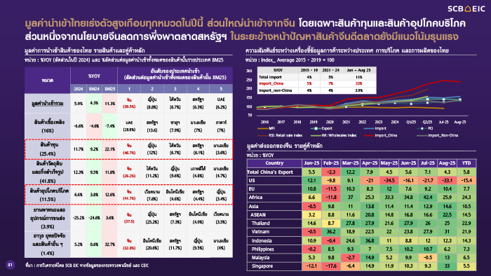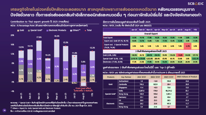 • ส่งออกชะลอ : ส่งออกไทยขยายตัวดีช่วง 8 เดือนแรกของปีจากการเร่ง Front-loading ก่อนสหรัฐฯ เริ่มเก็บภาษีนำเข้าสูงขึ้นและการส่งออกทองคำที่เร่งสูงตั้งแต่ต้นปี สัญญาณส่งออกชะลอลงชัดเจนขึ้นในเดือนสิงหาคม ที่ภาษีสหรัฐฯ 19% เริ่มใช้ช่วงต้นเดือน กลุ่มสินค้าหลักที่ขยายตัวสูงในตลาดสหรัฐฯ เหลือแค่สินค้าอิเล็กทรอนิกส์ที่สหรัฐฯ ยังยกเว้นการขึ้นภาษี ขณะที่หลายกลุ่มสินค้าพลิกกลับมาหดตัว SCB EIC มองส่งออกไทยจะหดตัวในช่วงที่เหลือของปีนี้และหดตัวต่อเนื่องในช่วงครึ่งแรกของปี 2569 เพราะ Front-loading ไปมากแล้ว และยังต้องเจอกำแพงภาษีนำเข้าตลาดสหรัฐฯ หลายรูปแบบที่มีความซับซ้อนและไม่แน่นอนสูง ในภาวะอุปสงค์โลกที่จะชะลอตัวลงด้วย
