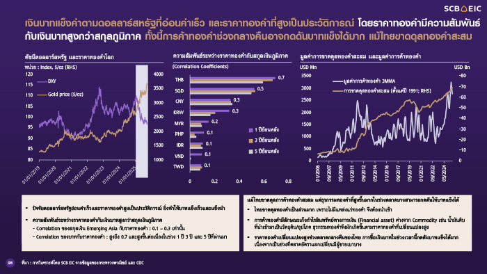 • บาทแข็งกดดันเศรษฐกิจเพิ่มเติม : ค่าเงินบาทเทียบกับดอลลาร์สหรัฐแข็งขึ้นเร็วในปีนี้กว่า 8% แข็งสุดในรอบ 4 ปี และแข็งนำคู่แข่งในภูมิภาค ส่งผลให้ดัชนีค่าเงินบาทเทียบกับคู่ค้าคู่แข่งสำคัญแข็งค่ามากที่สุดตั้งแต่วิกฤติ 2540 โดยมีสาเหตุทั้งจากปัจจัยภายนอกโดยเฉพาะการอ่อนค่าของดอลลาร์สหรัฐและจากปัจจัยภายในของไทย ทั้งจากการส่งออกทองคำที่พุ่งสูงขึ้นมากตามราคาทองคำที่สูงขึ้นเร็ว การเกินดุลบัญชีเดินสะพัด และเงินทุนที่ไหลเข้าตลาดพันธบัตร การแข็งค่าของเงินบาทมากเช่นนี้ไม่สอดคล้องกับปัจจัยพื้นฐานของเศรษฐกิจไทยที่มีแนวโน้มขยายตัวต่ำ เงินบาทจึงอาจกลายเป็นปัจจัยกดดันเศรษฐกิจเพิ่มเติม (Shock amplifier) กระทบความสามารถในการแข่งขันของภาคส่งออกซ้ำเติมผลกระทบภาษีทรัมป์ รวมถึงกดดันการฟื้นตัวของภาคท่องเที่ยว ทั้งนี้กลุ่มธุรกิจที่จะได้รับผลกระทบรุนแรงจากบาทแข็ง ได้แก่ อุตสาหกรรมที่พึ่งพาการส่งออกสูงและใช้ปัจจัยการผลิตจากในประเทศเป็นหลัก เช่น สินค้าเกษตร รวมถึงธุรกิจบริการที่พึ่งพารายได้ต่างชาติสูง เช่น ภาคการท่องเที่ยว ธุรกิจเหล่านี้จะได้รับผลกระทบจากการแปลงรายได้ดอลลาร์สหรัฐเป็นรูปเงินบาทเพื่อจ่ายค่าวัตถุดิบและค่าจ้าง ในช่วงบาทแข็งอาจขาดทุนอัตราแลกเปลี่ยน