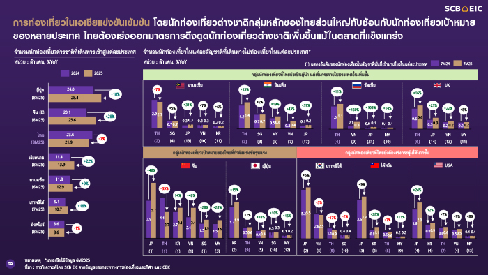 • นักท่องเที่ยวต่างชาติยังต่ำกว่าปีก่อนมาก แต่เริ่มมีสัญญาณพ้นจุดต่ำสุด : นักท่องเที่ยวจีนยังต่ำกว่าปีที่แล้ว แต่เริ่มหดตัวน้อยลง นักท่องเที่ยวส่วนใหญ่มีแนวโน้มระมัดระวังการใช้จ่ายมากขึ้น นอกจากนี้ ยังมีการแข่งขันดึงดูดนักท่องเที่ยวในเอเชีย ซึ่งนักท่องเที่ยวกลุ่มหลักของไทยส่วนใหญ่เป็นกลุ่มเป้าหมายเดียวกับหลายประเทศ นอกจากนี้เงินบาทที่แข็งค่าต่อเนื่องเสี่ยงจะทำให้ไทยเสียเปรียบการแข่งขัน ทั้งกับประเทศปลายทางอื่น โดยเฉพาะเวียดนามและจีนที่ค่าเงินอ่อนค่ากว่าประเทศอื่นในปีนี้ และการดึงดูดนักท่องเที่ยวอินเดีย, สหรัฐฯ และจีนที่สกุลเงินอ่อนค่ากว่าเงินบาท ทำให้การฟื้นตัวนักท่องเที่ยวต่างชาติในระยะข้างหน้ายังมีความท้าทาย
