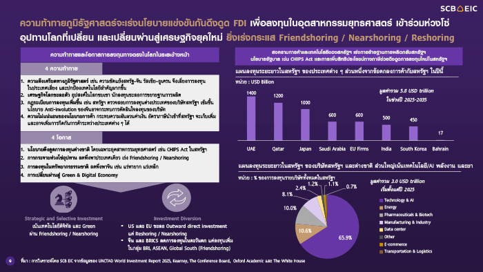 ทั้งนี้กำแพงภาษีสหรัฐฯ ยิ่งเร่งให้เศรษฐกิจโลกแบ่งขั้ว (Decoupling) และมีแนวโน้มกดดันการค้าการลงทุน โดยเฉพาะการค้าระหว่างขั้ว มองไปข้างหน้ากิจกรรมเศรษฐกิจโลกจะถูกขับเคลื่อนจากกระแสการลงทุนในอุตสาหกรรมยุทธศาสตร์ เช่น ดิจิทัล เทคโนโลยี AI และพลังงานสะอาด ทิศทางการกระจายความเสี่ยงออกจากจีน (China +1) การย้ายฐานการผลิตสู่ประเทศที่มีความเสี่ยงภูมิรัฐศาสตร์ต่ำกว่า ประเทศใกล้เคียง หรือประเทศพันธมิตร (Nearshoring and Friendshoring) รวมถึงการเพิ่มการลงทุนและย้ายฐานการผลิตกลับสหรัฐฯ (Reshoring) ส่วนหนึ่งเป็นผลจากข้อตกลงการค้ากับสหรัฐฯ