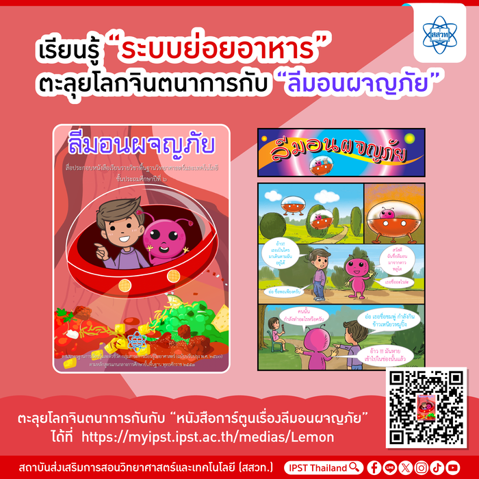 เรียนหรือเล่นก็เป็นสุข ไปสนุกตะลุยโลกจินตนาการกันกับ “หนังสือการ์ตูนเรื่องลีมอนผจญภัย”สื่อการเรียนรู้เกี่ยวกับระบบย่อยอาหาร นำเสนอในรูปแบบการ์ตูน 4 สี เพื่อให้นักเรียนได้ศึกษาเรื่องลักษณะและหน้าที่ของอวัยวะในระบบย่อยอาหาร