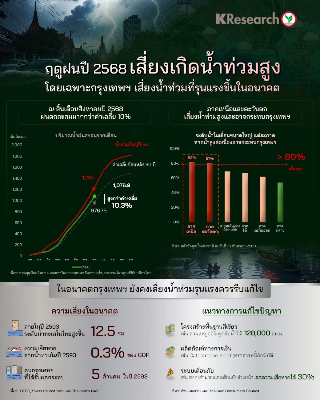 ในช่วง 8 เดือนแรกของปี 2568 ปริมาณฝนตกสะสมทั่วประเทศสูงกว่าค่าเฉลี่ยย้อนหลัง 30 ปี ถึง 10.3% และสถานการณ์ระดับน้ำล่าสุด (ณ 16 กันยายน 2568) ของเขื่อนในภาคเหนือและภาคตะวันตกมีความเสี่ยงสูงที่ต้องเฝ้าระวัง (มากกว่า 80%) ซึ่งหากน้ำยังสูงต่อเนื่องอาจส่งผลกระทบถึงกรุงเทพฯ และเขตรอบข้าง