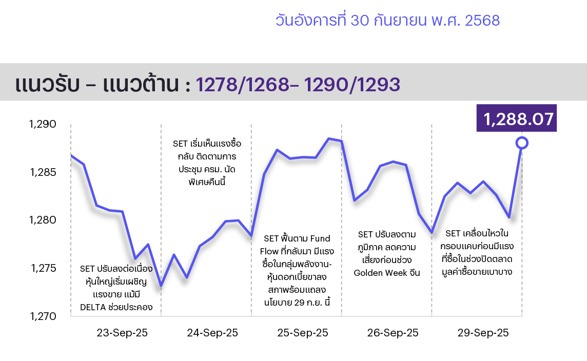 • นายกฯ อนุทินแถลงนโยบายเร่งแก้ปัญหา 5 ด้าน 15 นโยบายสำคัญภายใน 4 เดือน ด้านเศรษฐกิจจะเน้นลดค่าครองชีพ-เพิ่มกำลังซื้อ, แก้หนี้รายย่อย-หนุนสภาพคล่อง SMEs, เปิดโอกาสออมผ่านพันธบัตร และฟื้นท่องเที่ยว มองเป็นบวกต่อ SET โดยเฉพาะกลุ่มค้าปลีก (CPAXT BJC TNP CPALL) สินค้าอุปโภคบริโภค (CBG OSP HTC ICHI SAPPE) ท่องเที่ยว (AOT CENTEL ERW AWC MINT) กลุ่มไฟแนนซ์เป็นบวกต่อสินเชื่อ (MTC SAWAD TIDLOR)