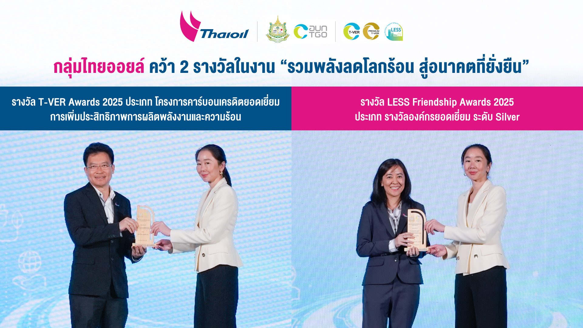เมื่อเร็วๆ นี้ คุณภูพิงค์ ทวีทรัพย์ ผู้จัดการฝ่ายความยั่งยืนองค์กร และคุณกิติยา ภักดีรัตนมิตร ผู้จัดการ-งานบริหารจัดการก๊าซเรือนกระจก บริษัท ไทยออยล์ จำกัด (มหาชน) เป็นผู้แทนกลุ่มไทยออยล์ รับมอบรางวัล T-VER Awards 2025 ประเภทรางวัลโครงการคาร์บอนเครดิตยอดเยี่ยม ประเภทการเพิ่มประสิทธิภาพการผลิตพลังงานและความร้อน ในฐานะที่บริษัท ท็อป เอสพีพี จำกัด มีโครงการที่มีปริมาณคาร์บอนเครดิตที่ได้รับการรับรองจากองค์การบริหารจัดการก๊าซเรือนกระจก (องค์การมหาชน) (อบก.) สูงสุดในประเภทดังกล่าว และรางวัล LESS Friendship Awards 2025 ประเภทรางวัลองค์กรยอดเยี่ยม ระดับ Silver ในฐานะที่บริษัท ไทยออยล์ จำกัด (มหาชน) มีบทบาทสำคัญในการลดการปล่อยก๊าซเรือนกระจกผ่านโครงการสนับสนุนกิจกรรมลดก๊าซเรือนกระจก (LESS) อย่างต่อเนื่อง ในงาน “รวมพลังลดโลกร้อน สู่อนาคตที่ยั่งยืน” จาก อบก. โดยมี ดร. ชญานันท์ ภักดีจิตต์ ปลัดกระทรวงทรัพยากรธรรมชาติและสิ่งแวดล้อม เป็นประธานในพิธี ณ ห้องอัศวิน แกรนด์ บอลรูม โรงแรมอัศวิน แกรนด์ คอนเวนชั่น