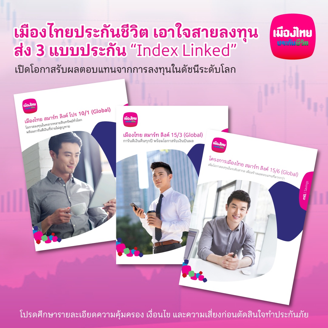ขณะที่ “เมืองไทย สมาร์ท ลิงค์ 15/6 (Global)” เพิ่มโอกาสลงทุนในระดับสากล เพื่อสร้างผลตอบแทนที่มากกว่า ด้วยการเลือกลงทุนในสินทรัพย์ทั่วโลกที่มีศักยภาพสูง การันตีผลประโยชน์แน่นอนระหว่างสัญญา มั่นใจได้ในทุกสภาวะเศรษฐกิจ เพิ่มโอกาสรับผลตอบแทนจากการลงทุนส่วนเพิ่ม (Upside gain) ผ่านดัชนี GS Momentum Builder® Multi-Asset 5S ER พัฒนาและบริหารจัดการโดย Goldman Sachs พร้อมรับเงินคืนทุก ๆ 2 ปีกรมธรรม์ ปีละ 5%* การันตีเบี้ยประกันที่จ่ายไม่สูญหาย ครบกำหนดสัญญาได้รับเงินก้อนใหญ่ จ่ายเบี้ยประกันภัย 6 ปี แต่ได้รับความคุ้มครองชีวิตยาว 15 ปี (ความคุ้มครองชีวิตเพิ่มขึ้นเป็นขั้นบันได) เบี้ยประกันภัยเริ่มต้นปีละ 20,000 บาท