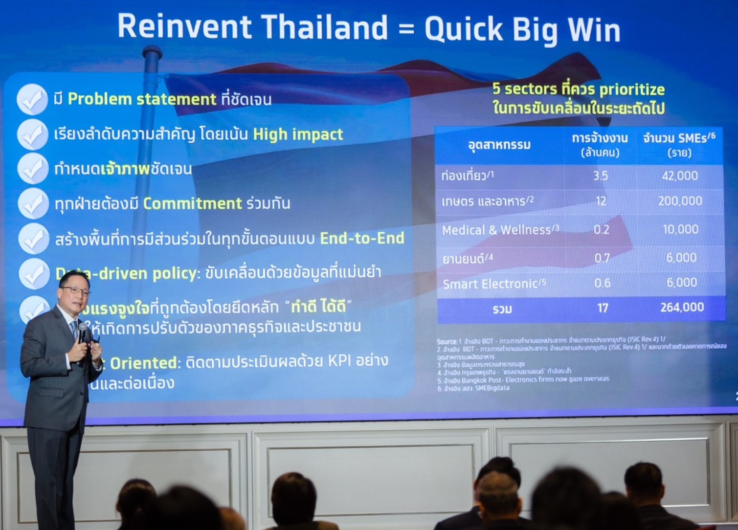 ทั้งนี้ “Reinvent Thailand เน้นการมีส่วนร่วม โดยภาคเอกชนเป็นแกนหลักในการขับเคลื่อน ภาคการเงินช่วยจัดสรรทรัพยากรอย่างมีประสิทธิภาพ ขณะที่ภาครัฐสนับสนุนและสร้างสภาพแวดล้อมที่เอื้อต่อการปรับตัว โดยการทำงานของแพลตฟอร์ม Reinvent Thailand เริ่มจากการมีการระบุปัญหาที่ชัดเจน เรียงลำดับความสำคัญโดยเน้นเรื่องที่มีผลลัพธ์สูง (High impact) พร้อมกำหนดเจ้าภาพที่ชัดเจน เพื่อให้ทุกฝ่ายมี Commitment ร่วมกัน ในการขับเคลื่อน สร้างพื้นที่การมีส่วนร่วมครบทุกขั้นตอนแบบ End-to-End ใช้ Data-driven policy โดยอาศัยข้อมูลที่ถูกต้องแม่นยำเป็นหลัก ขณะเดียวกันยังต้องสร้างแรงจูงใจที่ถูกต้องภายใต้หลัก “ทำดี ได้ดี” เพื่อให้เกิดการปรับตัวของภาคธุรกิจและประชาชน และสุดท้ายต้องมุ่งเน้น Result Oriented โดยติดตามและประเมินผลอย่างต่อเนื่องด้วย KPI ที่ชัดเจน ทั้งนี้ ควรให้ความสำคัญกับ 5 อุตสาหกรรมที่จะสร้างมูลค่าเพิ่มให้กับเศรษฐกิจก่อให้เกิดการจ้างงานและยกระดับรายได้ครัวเรือน ประกอบด้วย อุตสาหกรรมท่องเที่ยว เกษตรและอาหาร ยานยนต์ Medical & Wellness และ Smart Electronic