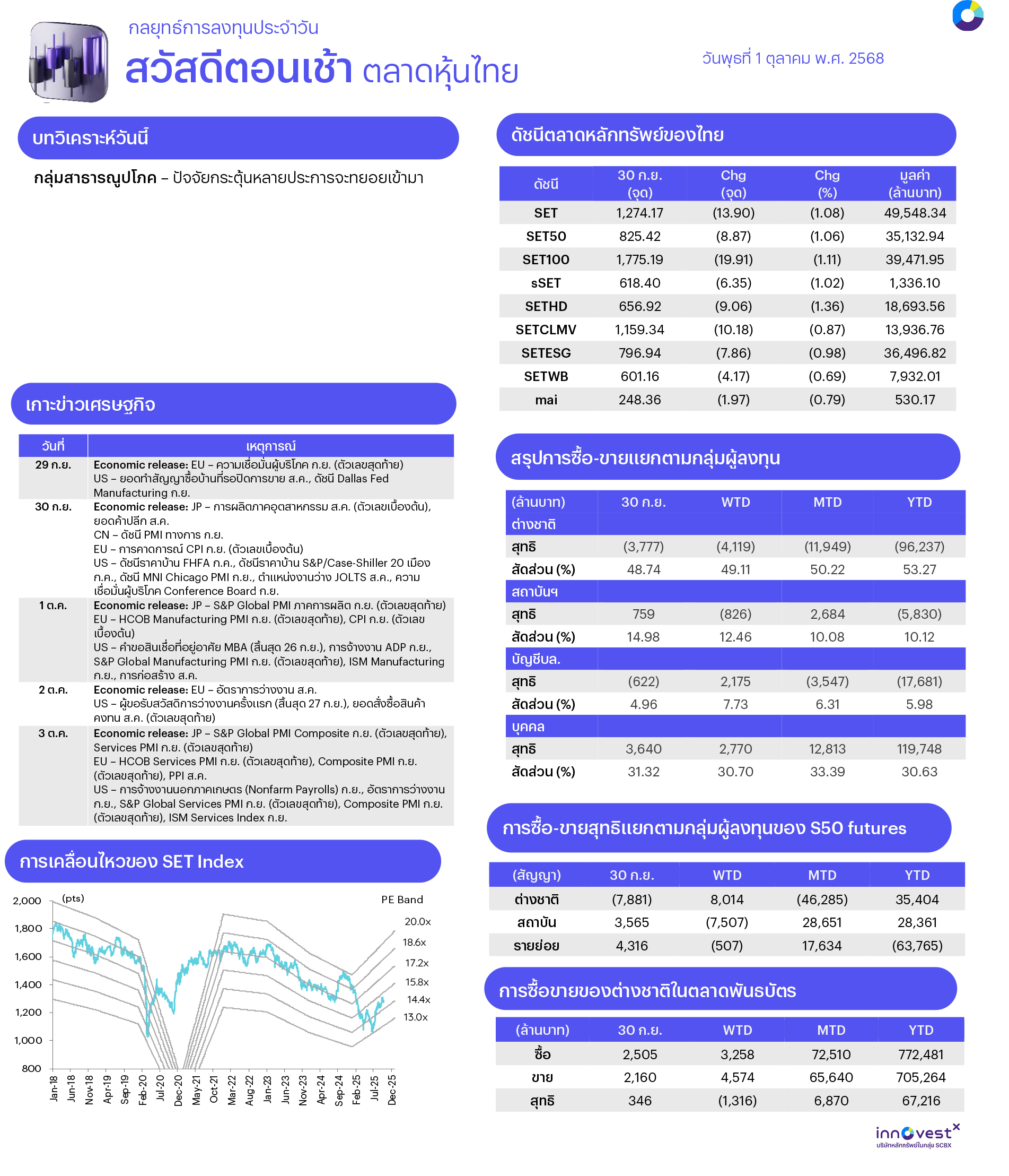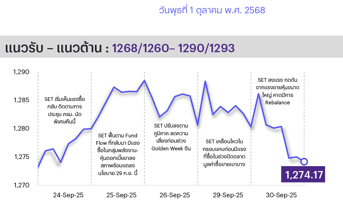 คาดตลาดแกว่งไซด์เวย์/พักตัว รัฐบาลเริ่มกระตุ้นการบริโภคหลัง ครม. เห็นชอบการเติมเงินเข้าบัตรสวัสดิการแห่งรัฐในเดือน พ.ย. และ ธ.ค. ครั้งละ 850 บาท ส่วนโครงการคนละครึ่งพลัสจะเข้า ครม. สัปดาห์หน้า ทางเทคนิค ตลาดยังไม่สามารถยืนเหนือแนวต้าน 1290-1293 กลับมาปรับตัวลงหลุดต่ำกว่าแนวรับแรกที่ 1278 หากลงหลุดต่ำกว่าแนวรับสองที่ 1268 อีกจะเป็นการแกว่งตัวลงรอบใหม่มีแนวรับถัดไปที่ 1260