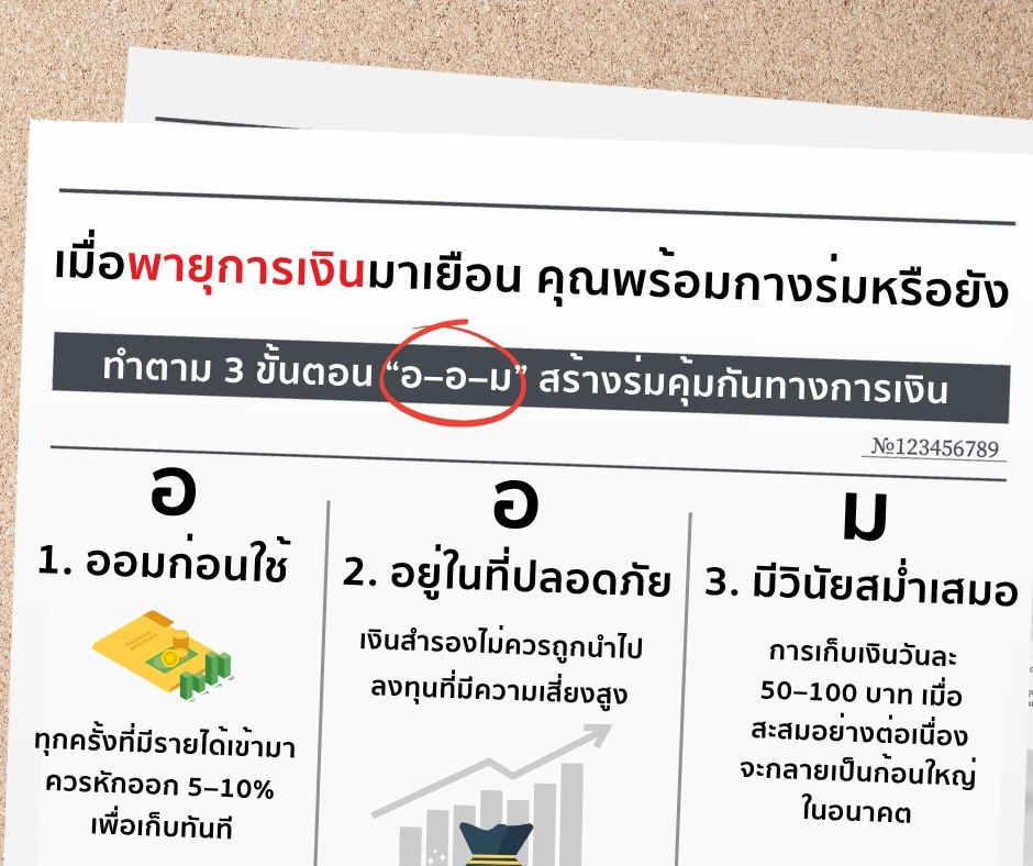 ผลสำรวจระหว่างปี พ.ศ. 2563–2565 โดยธนาคารแห่งประเทศไทยร่วมกับสำนักงานสถิติแห่งชาติ พบว่า แม้คนไทยมีเงินออมเพิ่มขึ้นเป็น 74.7% จาก 72.0% ในปี 2561 แต่มีเพียง 38% เท่านั้นที่มีเงินสำรองเพียงพอเกิน 3 เดือน สะท้อนว่าคนไทยแม้ออมเงิน แต่ยังไม่พร้อมรับมือเหตุฉุกเฉินจริงๆ เคทีซีจึงได้รวบรวม 3 ขั้นตอน “อ–อ–ม” เพื่อเริ่มต้นสร้างร่มคุ้มกันทางการเงิน ที่จะช่วยให้ชีวิตมั่นใจได้แม้ในวันที่ฝนตกหนักที่สุด