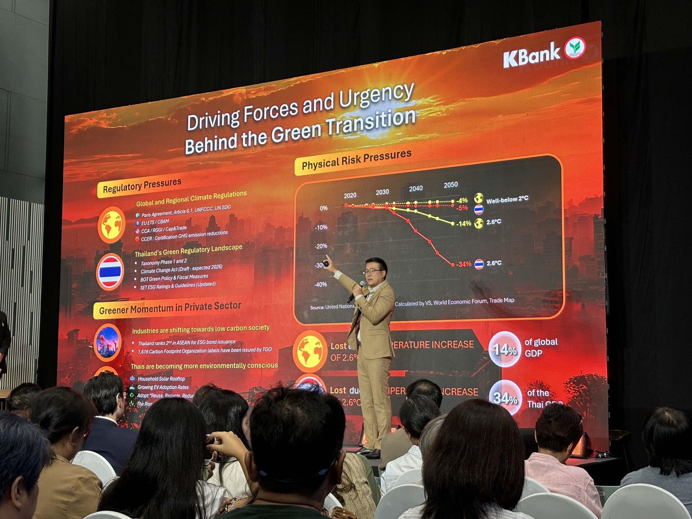 นายจงรัก รัตนเพียร ผู้จัดการใหญ่ ธนาคารกสิกรไทย เปิดเผยว่า ความท้าทายที่ประเทศไทยกำลังเผชิญ มีทั้งปัจจัยภายในประเทศที่เป็นปัญหาเชิงโครงสร้างซึ่งส่งผลต่อศักยภาพในการแข่งขัน อาทิ หนี้สาธารณะและหนี้ครัวเรือนที่ยังอยู่ในระดับสูง ความขัดแย้งด้านภูมิรัฐศาสตร์และสงครามการค้า การเปลี่ยนแปลงด้านสภาพภูมิอากาศ ซึ่งรวมถึงมาตรการทางการค้าจากประเทศคู่ค้าสำคัญ อาทิ EU CBAM ที่จะเริ่มเก็บค่าธรรมเนียมคาร์บอนตั้งแต่ปี 2569 เป็นต้นไป ที่คาดว่าจะส่งผลกระทบต่อการส่งออกของไทยเพิ่มมากขึ้น จากปัจจุบันครอบคลุมมูลค่าสินค้า 1.1 หมื่นล้านบาท เป็นราว 2.8 หมื่นล้านบาท ภายในปี 2573 ดังนั้นธุรกิจที่ปรับตัวได้ก่อนจะสร้างความได้เปรียบ