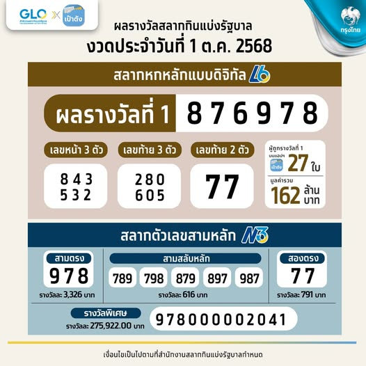 สลากดิจิทัล บนแอปฯเป๋าตัง ของธนาคารกรุงไทย งวดวันที่ 1 ต.ค. 68 เลขสลากรางวัลที่ 1: 876978 มีคนถูกรางวัลที่ 1 รวม 27 ใบ 162 ล้านบาท