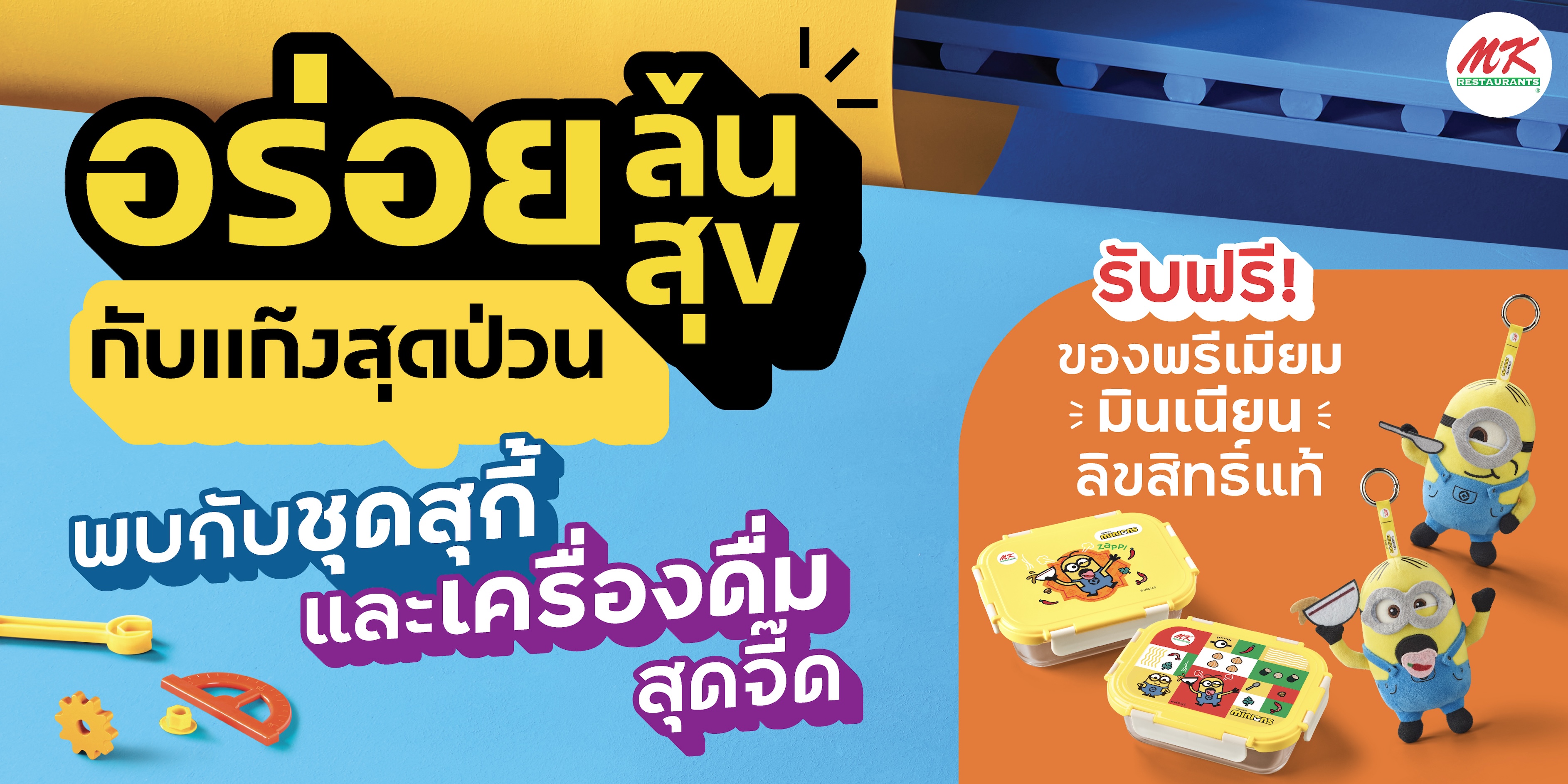 ปฎิบัติการณ์ป่วนทั่วไทย MK Restaurants เสิร์ฟกลยุทธ์ Brand Collaboration กับมินเนี่ยน คาแรกเตอร์ดังระดับโลก ร่วมแคมเปญ “อร่อยล้นสุขกับแก๊งสุดป่วน” ปล่อยเมนูพิเศษให้ทานได้ที่ร้านทั้งสาขาปกติ และสาขาที่ร่วมรายการ โปรโมชั่น คุ้มเกินคุ้ม 299 บาท ทั้งเมนู ลูกชิ้น Minions, ซาลาเปา Minions และเครื่องดื่มสีสันสดใส สร้างประสบการณ์ใหม่ ทั้งยังมีของพรีเมียมคอลเลคชันพิเศษน่าสะสมอีกด้วย